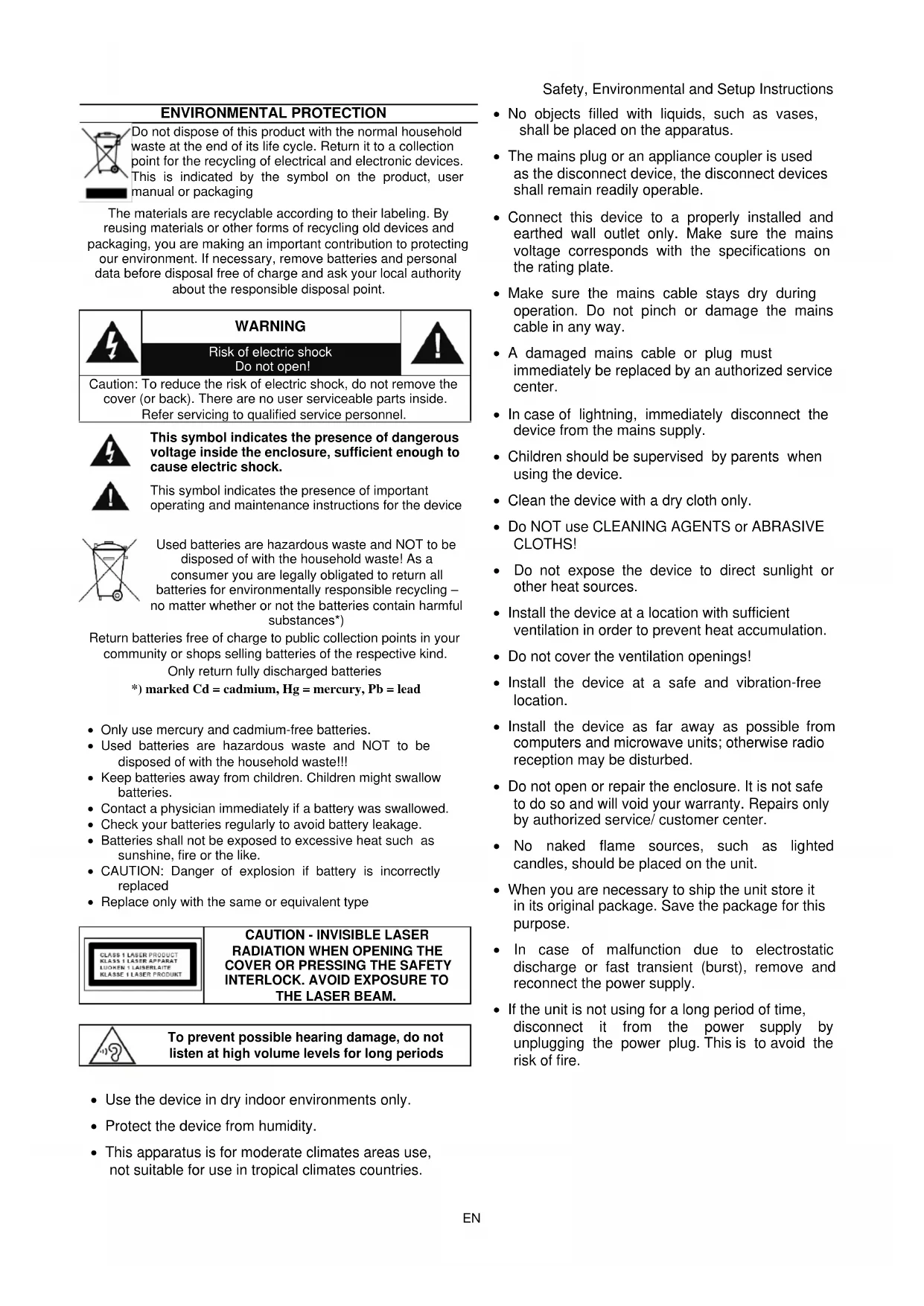 Caution: Usage of controls or adjustments or performance of procedures other than those specified herein may result in hazardous radiation exposure. This unit should not be adjusted or repaired by anyone except qualified service personnel. Important: Since movement of the CD mechanism and the sensitive circuitry may cause interference to the radio tuner nearby, switch this unit off while operating other radio devices Precautions for use Installation