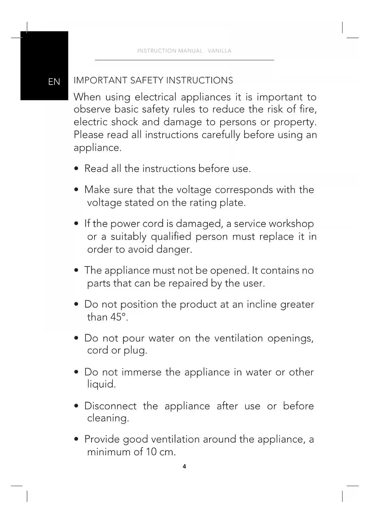 - Provide good ventilation around the appliance, a minimum of 10 cm.5