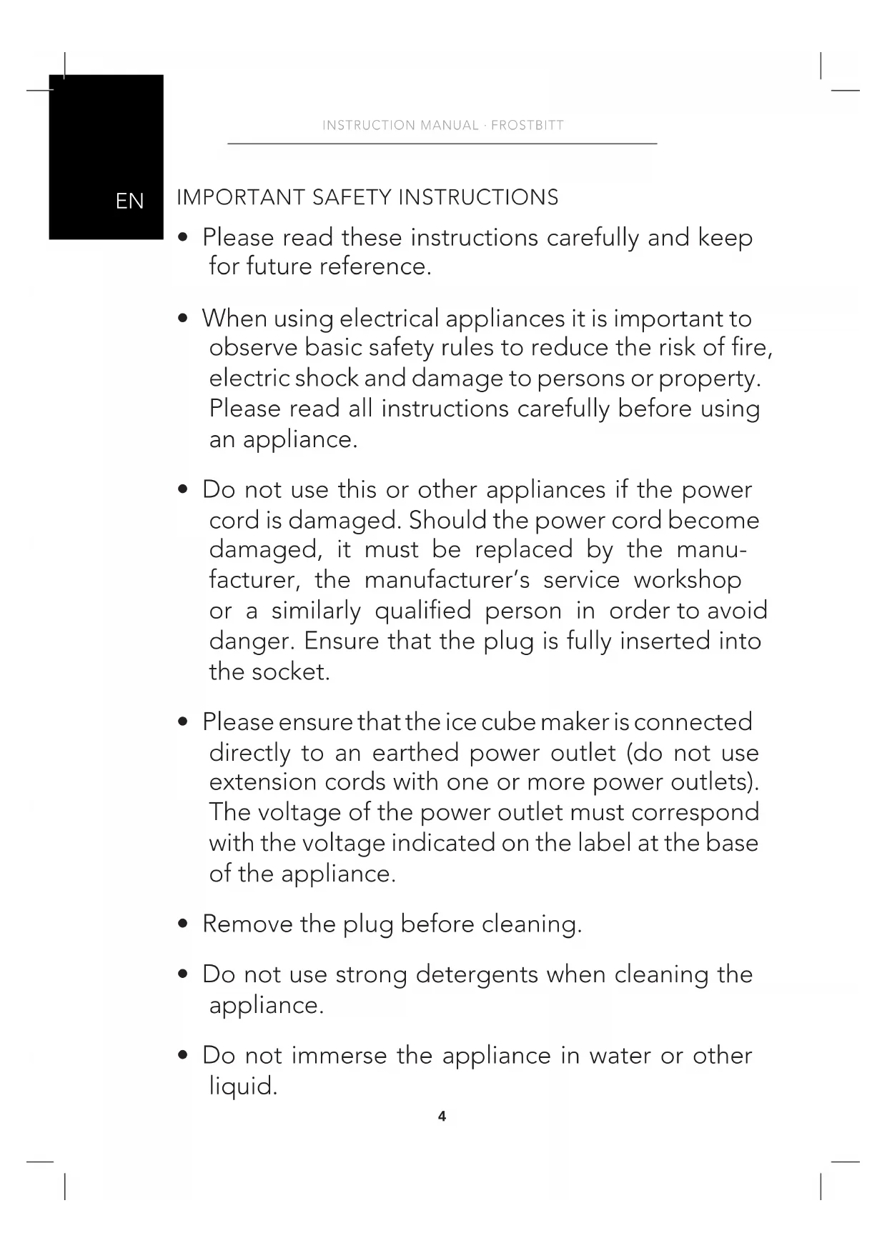 - Please ensure that the ice cube maker is connected directly to an earthed power outlet (do not use extension cords with one or more power outlets). The voltage of the power outlet must correspond with the voltage indicated on the label at the base of the appliance.