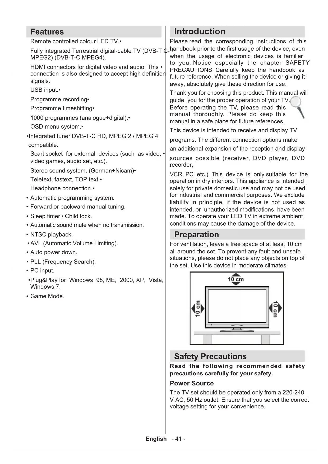 - Integrated tuner DVB-T-C HD, MPEG 2 / MPEG 4 compatible. Scart socket for external devices (such as video, • video games, audio set, etc.). Stereo sound system. (German+Nicam)• Teletext, fastext, TOP text.• Headphone connection.• Automatic programming system.• Forward or backward manual tuning.• Sleep timer / Child lock.• Automatic sound mute when no transmission.• NTSC playback. • AVL (Automatic Volume Limiting).• Auto power down.• PLL (Frequency Search).• PC input. • Plug&Play for Windows 98, ME, 2000, XP, Vista, • Windows 7. Game Mode. • Introduction Please read the corresponding instructions of this handbook prior to the rst usage of the device, even when the usage of electronic devices is familiar to you. Notice especially the chapter SAFETY PRECAUTIONS. Carefully keep the handbook as future reference. When selling the device or giving it away, absolutely give these direction for use. Thank you for choosing this product. This manual will guide you for the proper operation of your TV. Before operating the TV, please read this manual thoroughly. Please do keep this manual in a safe place for future references. This device is intended to receive and display TV programs. The different connection options make an additional expansion of the reception and display sources possible (receiver, DVD player, DVD recorder, VCR, PC etc.). This device is only suitable for the operation in dry interiors. This appliance is intended solely for private domestic use and may not be used for industrial and commercial purposes. We exclude liability in principle, if the device is not used as intended, or unauthorized modications have been made. To operate your LED TV in extreme ambient conditions may cause the damage of the device. Preparation For ventilation, leave a free space of at least 10 cm all around the set. To prevent any fault and unsafe situations, please do not place any objects on top of the set. Use this device in moderate climates. Safety Precautions Read the following recommended safety precautions carefully for your safety. Power Source The TV set should be operated only from a 220-240 V AC, 50 Hz outlet. Ensure that you select the correct voltage setting for your convenience.English - 42 - Power Cord Do not place the set, a piece of furniture, etc. on the power cord (mains lead) or pinch the cord. Handle the power cord by the plug. Do not unplug the appliance by pulling from the power cord and never touch the power cord with wet hands as this could cause a short circuit or electric shock. Never make a knot in the cord or tie it with other cords. The power cords should be placed in such a way that they are not likely to be stepped on. A damaged power cord can cause re or give you an electric shock. When it is damaged and needs to be replaced, it should be done by qualied personnel. Moisture and Water Do not use this device in a humid and damp place (avoid the bathroom, the sink in the kitchen, and near the washing machine). Do not expose this device to rain or water, as this may be dangerous and do not place objects filled with liquids, such as ower vases, on top. Avoid from dripping or splashing. If any solid object or liquid falls into the cabinet, unplug the TV and have it checked by qualied personnel before operating it any further. Cleaning Before cleaning, unplug the TV set from the wall outlet. Do not use liquid or aerosol cleaners. Use soft and dry cloth. Ventilation The slots and openings on the TV set are intended for ventilation and to ensure reliable operation. To prevent overheating, these openings must not be blocked or covered in anyway. Heat and Flames The set should not be placed near to open ames and sources of intense heat such as an electric heater. Ensure that no open ame sources, such as lighted candles, are placed on top of the TV. Batteries should not be exposed to excessive heat such as sunshine, re or the like. Lightning In case of storm and lightning or when going on holiday, disconnect the power cord from the wall outlet. Replacement Parts When replacement parts are required, make sure that the service technician has used replacement parts, which are specied by the manufacturer or have the same specications as the original one. Unauthorized substitutions may result in re, electrical shock or other hazards. Servicing Please refer all servicing to qualied personnel. Do not remove the cover yourself as this may result in an electric shock. Waste Disposal Instructions for waste disposal:• Packaging and packaging aids are recyclable and should principally be recycled. Packaging materials, such as foil bag, must be kept away from children. Batteries, including those which are heavy metal-free, should not be disposed of with household waste. Please dispose of used battery in an environment friendly manner. Find out about the legal regulations which apply in your area. Don’t try to recharge batteries. Danger of explosion. • Replace batteries only with the same or equivalent type. This symbol on the product or on its packaging means that your electrical and electronic device should be disposed at the end of its service life separately from your household wastes. There are separate collection systems for recycling in EU. For more information, please contact the local authority or the dealer where you purchased the product. Disconnecting the Device The mains plug is used to disconnect TV set from the mains and therefore it must remain readily operable. Headphone Volume Excessive sound pressure from earphones and headphones can cause hearing loss. Installation To prevent injury, this device must be securely attached to the wall in accordance with the installation instructions when mounted to the wall (if the option is available). LCD Screen The LCD panel is a very high technology product with about a million thin lm transistors, giving you ne picture details. Occasionally, a few non-active pixels may appear on the screen as a xed blue, g