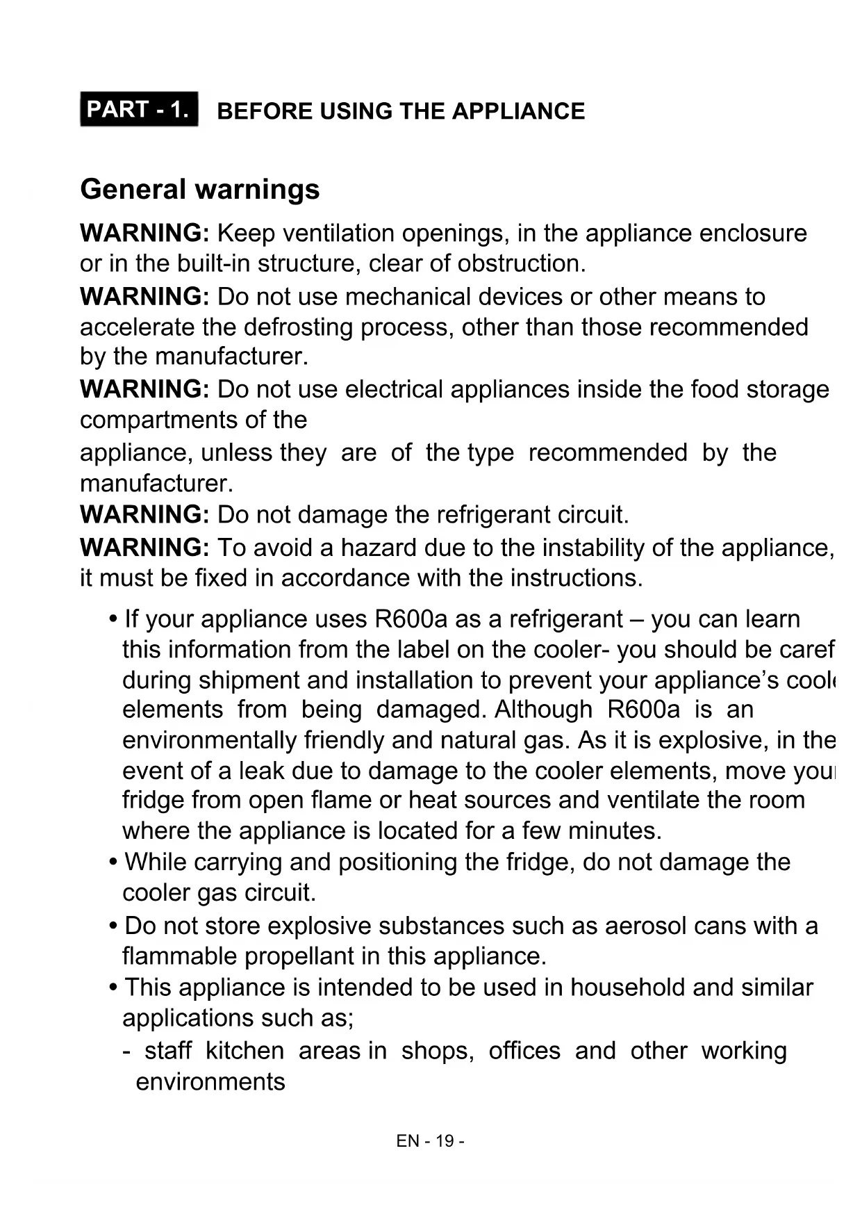 - If your appliance uses R600a as a refrigerant – you can learn this information from the label on the cooler- you should be careful during shipment and installation to prevent your appliance’s cooler elements from being damaged. Although R600a is an environmentally friendly and natural gas. As it is explosive, in the event of a leak due to damage to the cooler elements, move your fridge from open flame or heat sources and ventilate the room where the appliance is located for a few minutes.
