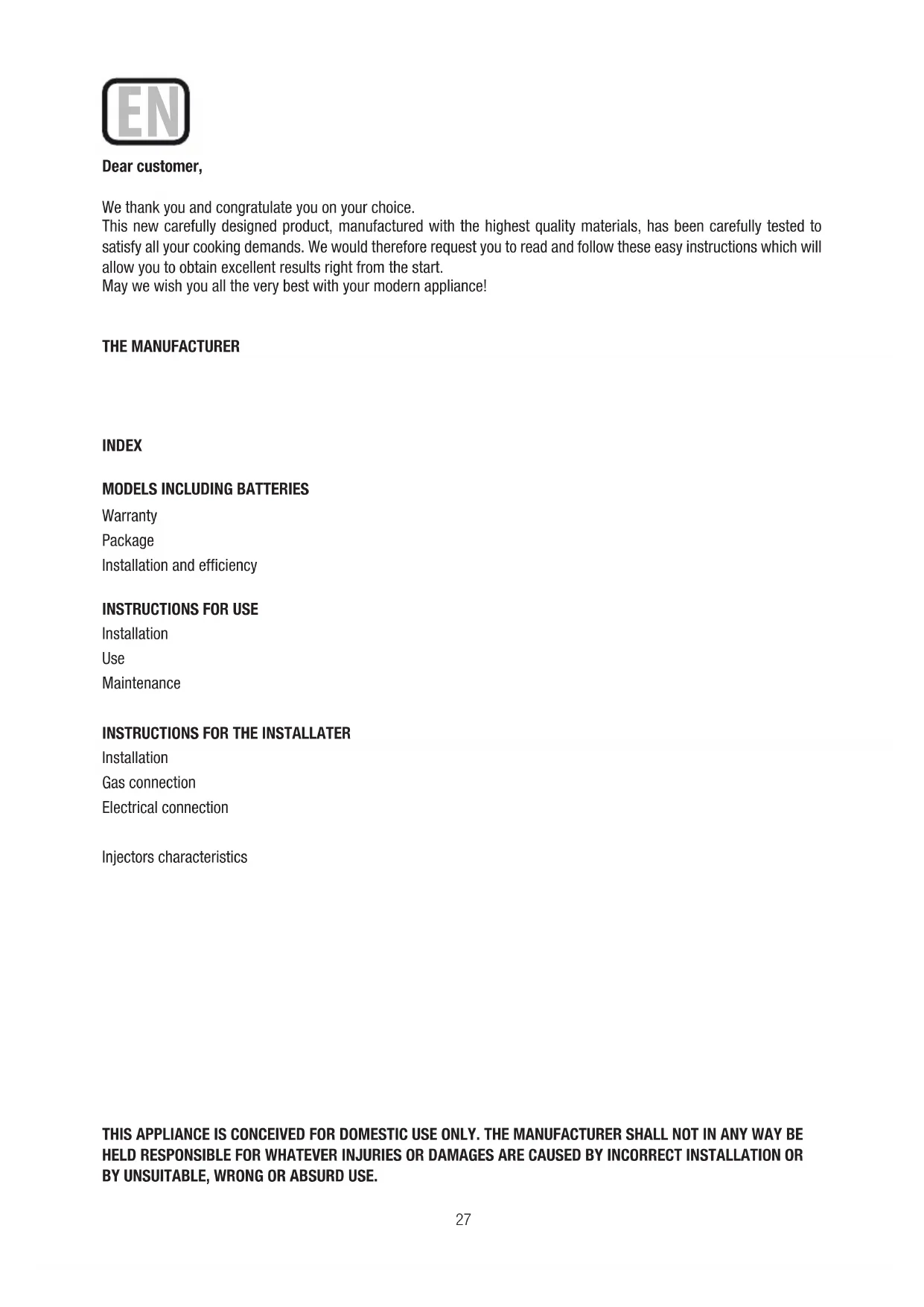 Installation Gas connection Electrical connection Injectors characteristics THIS APPLIANCE IS CONCEIVED FOR DOMESTIC USE ONLY. THE MANUFACTURER SHALL NOT IN ANY WAY BE HELD RESPONSIBLE FOR WHATEVER INJURIES OR DAMAGES ARE CAUSED BY INCORRECT INSTALLATION OR BY UNSUITABLE, WRONG OR ABSURD USE. EN28