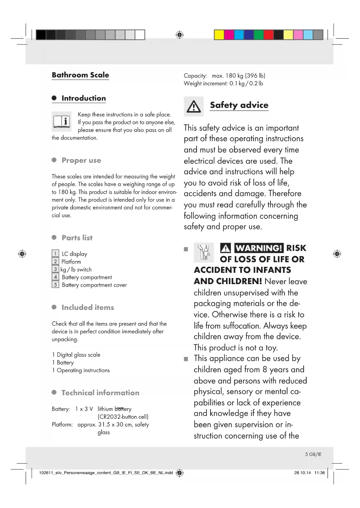 102611_silv_Personenwaage_content_GB_IE_FI_SE_DK_BE_NL.indd 4 28.10.14 11:365 GB/IE Bathroom Scale Introduction Keep these instructions in a safe place. If you pass the product on to anyone else, please ensure that you also pass on all the documentation. Proper use These scales are intended for measuring the weight of people. The scales have a weighing range of up to 180 kg. This product is suitable for indoor environ- ment only. The product is intended only for use in a private domestic environment and not for commer- cial use. Parts list