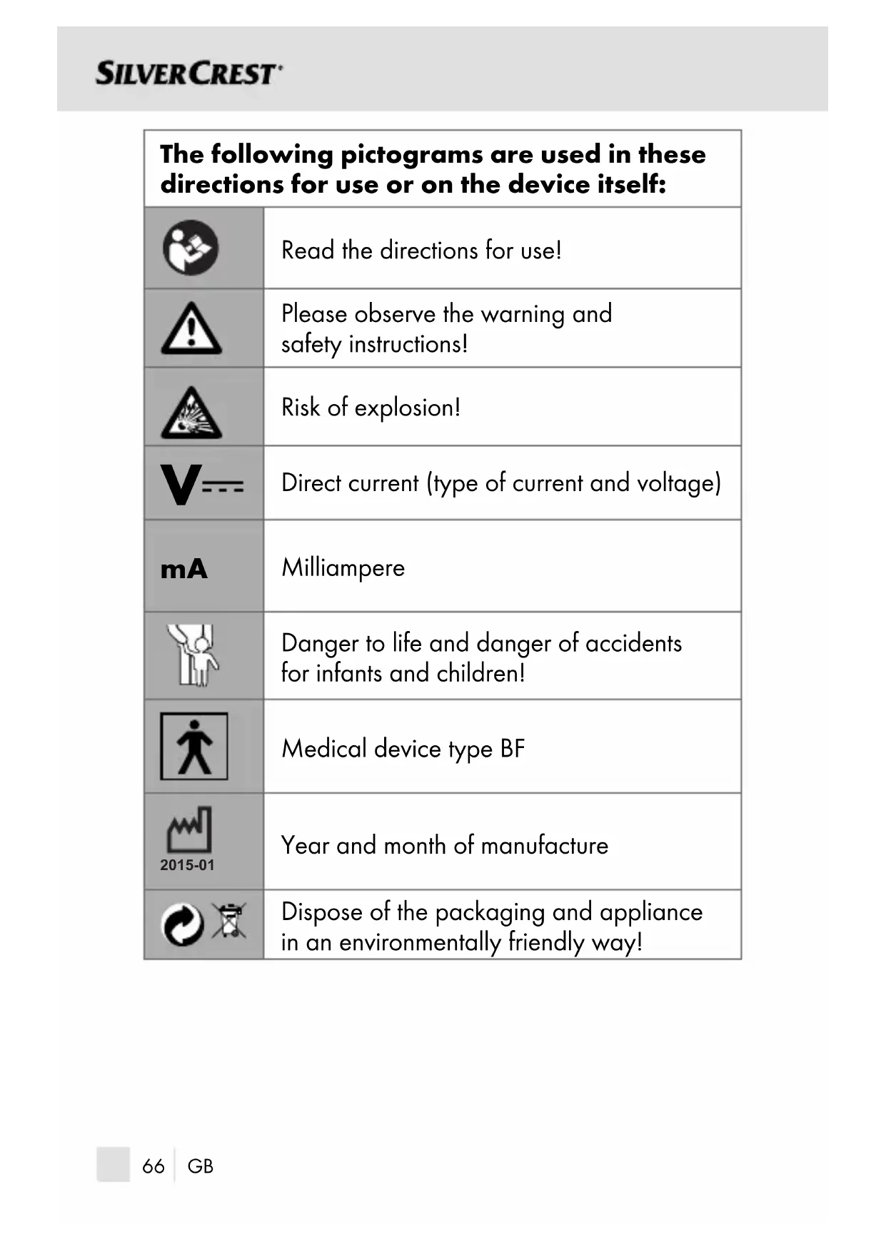 Milliampere Danger to life and danger of accidents for infants and children! Medical device type BF 2015-01 Year and month of manufacture Dispose of the packaging and appliance in an environmentally friendly way! IB_106635_SSOT6B2_FR_DE_GB_LB2.indd 66 19.09.14 14:0567 GB Forehead & Ear Thermometer