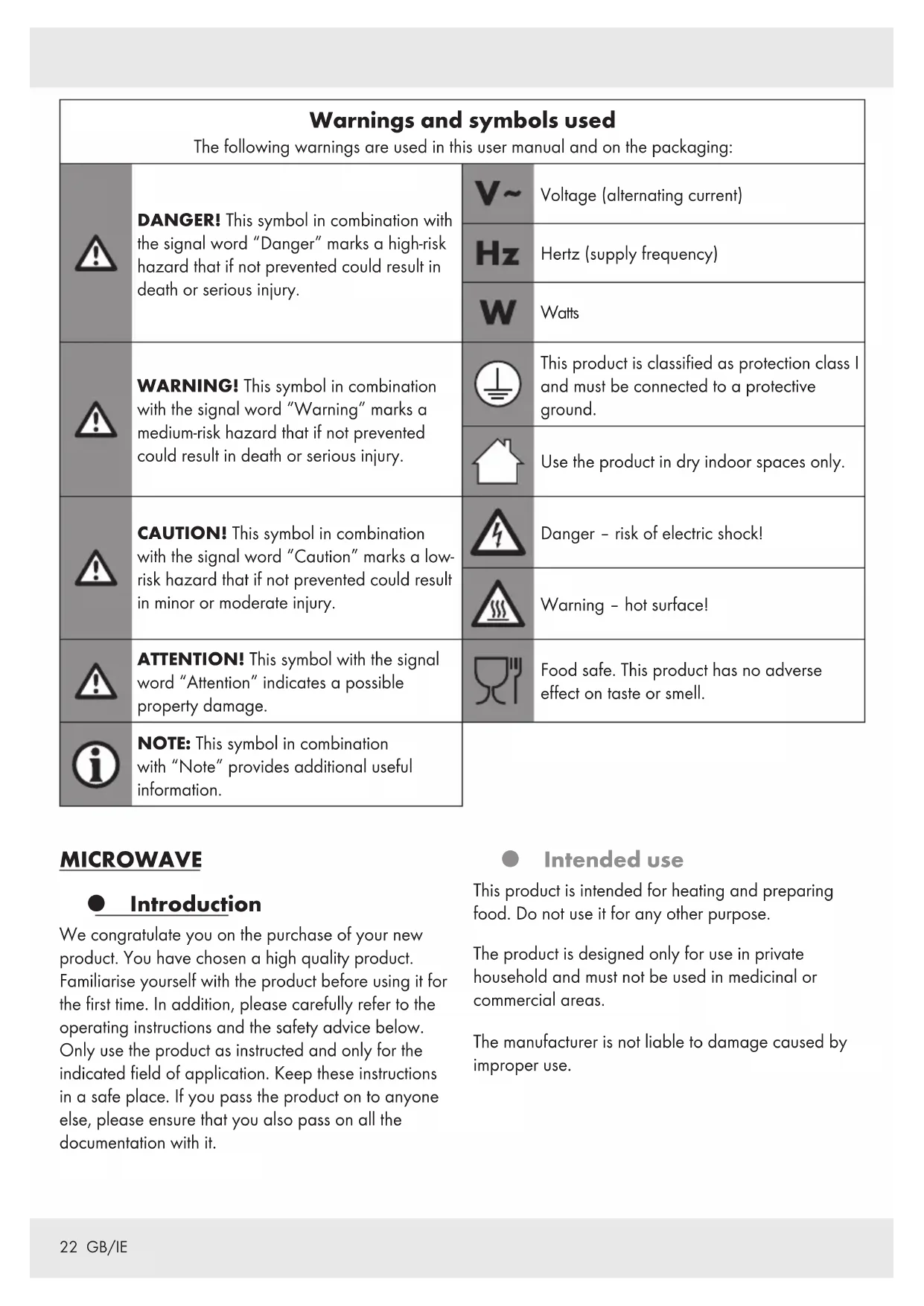 ¾ People fitted with a heart pacemaker should consult their doctor about the possible risks of using his product before taking it into use. m DANGER!Risk of burns! During use the product gets hot. Do not touch the product while in use nor immediately after use. m DANGER!Risk of electric shock! Do not immerse the product in water or other liquids. Never hold the product under running water. m DANGER!Risk of electric shock! Never use a damaged product. Disconnect the product from the power supply and contact your retailer if it is damaged. ¾ The product is not to be used if it has been dropped, if there are visible signs of damage. ¾ Before connecting the product to the power supply, check that the voltage and current rating corresponds with the power supply details shown on the product’s rating label. ¾ Protect the power cord against damages. Do not let it hang over sharp edges, do not squeeze or bend it. Keep the power cord away from hot surfaces and open flames. Positioning the product m ATTENTION! Do not install the product above a cooker or any other heat-generating device. Installation in such a location could cause damage to the product. Operation ¾ DANGER!Risk of fire! Remove all metallic closures from the packaging of the food that you intend to heat. ¾ Do not move the product while it is in operation. ¾ Never operate the product when it is empty.27 GB/IE ¾ Do not place the product on hot plates (gas, electric, coal cooking range etc.). Operate the product on a level, stable, clean, heat- resistant and dry surface. ¾ Do not place flammable materials close to the product. ¾ The product is not intended to be operated by means of an external timer or separate remote control system. Cleaning and care m WARNING!Risk of injury! Disconnect the product from the power supply before cleaning work and when not in use. ¾ Do not pull the power plug out of the electrical outlet by the power cord. ¾ Protect the product, its power cord and power plug against dust, direct sunlight, dripping and splashing water.