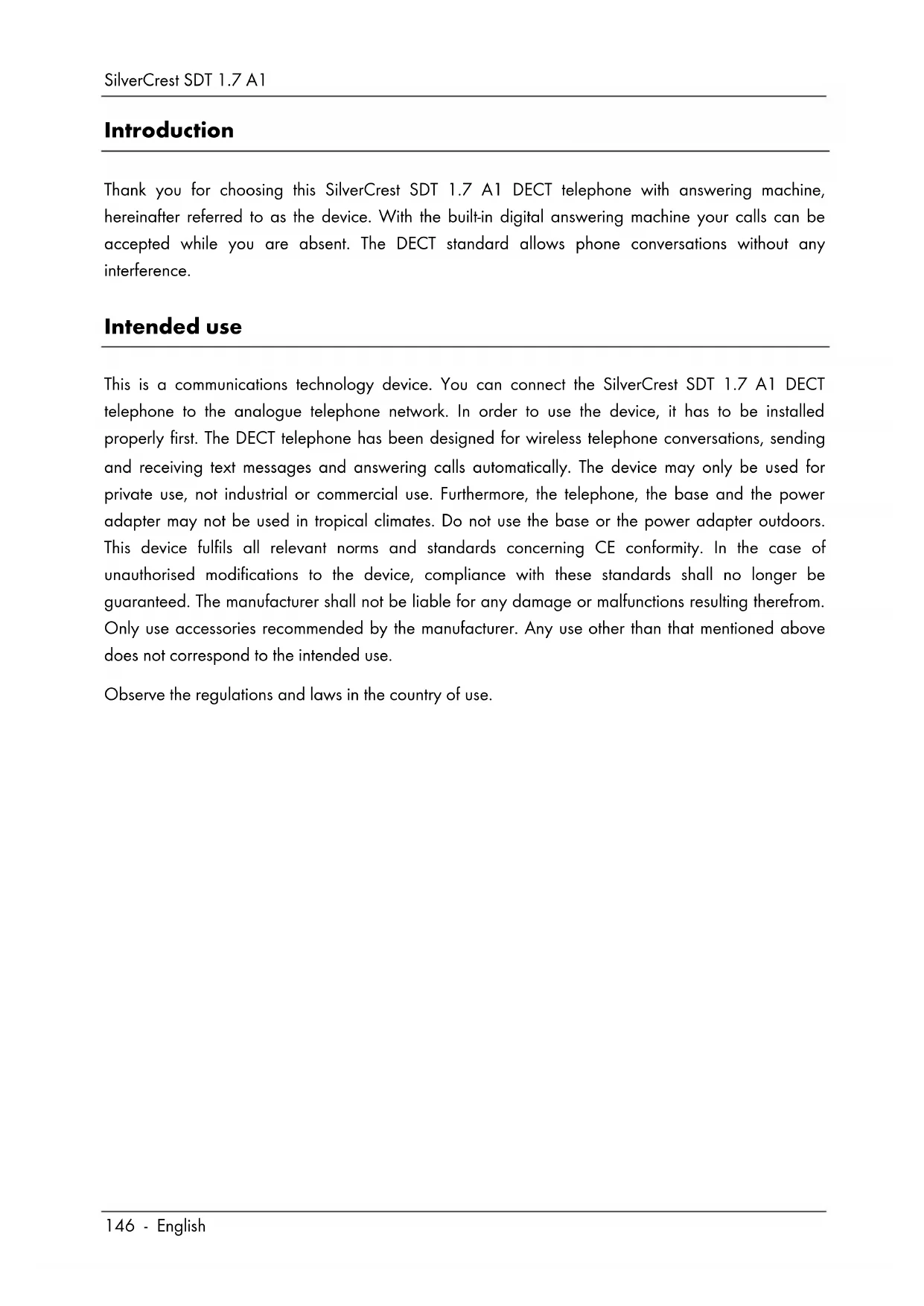 Introduction Thank you for choosing this SilverCrest SDT 1.7 A1 DECT telephone with answering machine, hereinafter referred to as the device. With the built-in digital answering machine your calls can be accepted while you are absent. The DECT standard allows phone conversations without any interference. Intended use This is a communications technology device. You can connect the SilverCrest SDT 1.7 A1 DECT telephone to the analogue telephone network. In order to use the device, it has to be installed properly first. The DECT telephone has been designed for wireless telephone conversations, sending and receiving text messages and answering calls automatically. The device may only be used for private use, not industrial or commercial use. Furthermore, the telephone, the base and the power adapter may not be used in tropical climates. Do not use the base or the power adapter outdoors. This device fulfils all relevant norms and standards concerning CE conformity. In the case of unauthorised modifications to the device, compliance with these standards shall no longer be guaranteed. The manufacturer shall not be liable for any damage or malfunctions resulting therefrom. Only use accessories recommended by the manufacturer. Any use other than that mentioned above does not correspond to the intended use. Observe the regulations and laws in the country of use.SilverCrest SDT 1.7 A1 English - 147 Package contents
