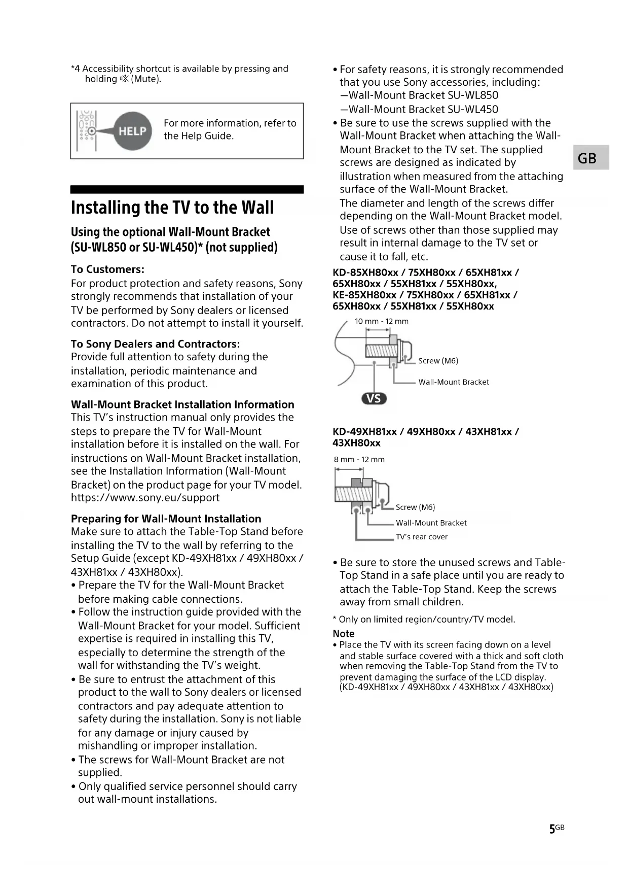 *4 Accessibility shortcut is available by pressing and holding (Mute). Installing the TV to the Wall Using the optional Wall-Mount Bracket (SU-WL850 or SU-WL450)* (not supplied) To Customers: For product protection and safety reasons, Sony strongly recommends that installation of your TV be performed by Sony dealers or licensed contractors. Do not attempt to install it yourself. To Sony Dealers and Contractors: Provide full attention to safety during the installation, periodic maintenance and examination of this product. Wall-Mount Bracket Installation Information This TV’s instruction manual only provides the steps to prepare the TV for Wall-Mount installation before it is installed on the wall. For instructions on Wall-Mount Bracket installation, see the Installation Information (Wall-Mount Bracket) on the product page for your TV model. https://www.sony.eu/support Preparing for Wall-Mount Installation Make sure to attach the Table-Top Stand before installing the TV to the wall by referring to the Setup Guide (except KD-49XH81xx / 49XH80xx / 43XH81xx / 43XH80xx).