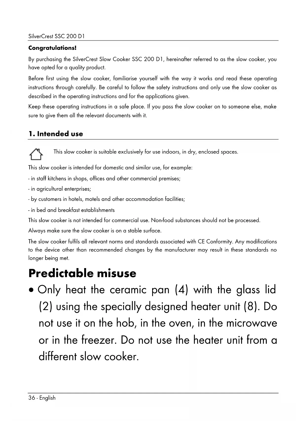 This slow cooker is suitable exclusively for use indoors, in dry, enclosed spaces. This slow cooker is intended for domestic and similar use, for example: - in staff kitchens in shops, offices and other commercial premises; - in agricultural enterprises; - by customers in hotels, motels and other accommodation facilities; - in bed and breakfast establishments This slow cooker is not intended for commercial use. Non-food substances should not be processed. Always make sure the slow cooker is on a stable surface. The slow cooker fulfils all relevant norms and standards associated with CE Conformity. Any modifications to the device other than recommended changes by the manufacturer may result in these standards no longer being met. Predictable misuse Only heat the ceramic pan (4) with the glass lid (2) using the specially designed heater unit (8). Do not use it on the hob, in the oven, in the microwave or in the freezer. Do not use the heater unit from a different slow cooker.SilverCrest SSC 200 D1