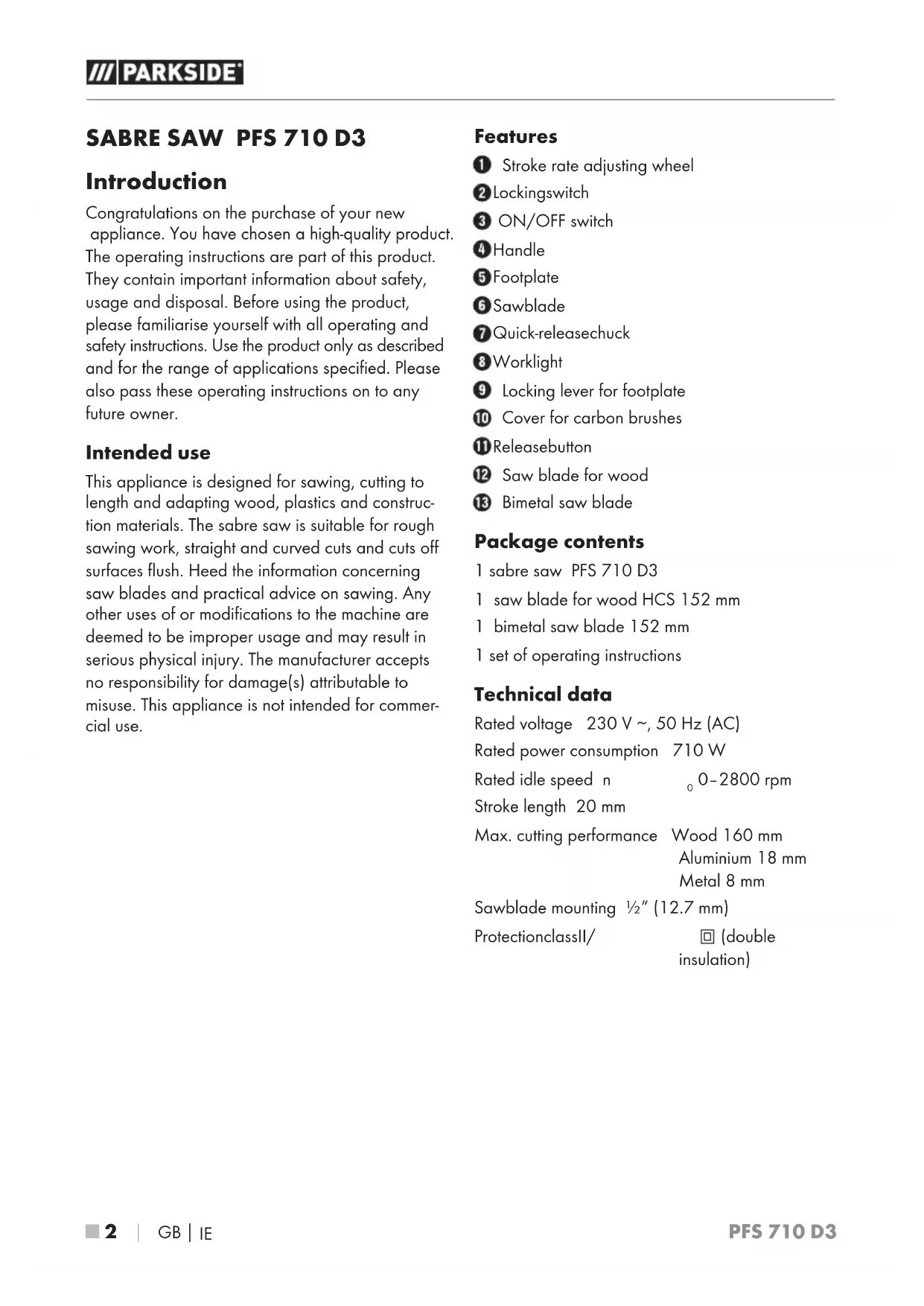 Introduction Congratulations on the purchase of your new appliance. You have chosen a high-quality product. The operating instructions are part of this product. They contain important information about safety, usage and disposal. Before using the product, please familiarise yourself with all operating and safety instructions. Use the product only as described and for the range of applications specified. Please also pass these operating instructions on to any future owner. Intended use This appliance is designed for sawing, cutting to length and adapting wood, plastics and construc- tion materials. The sabre saw is suitable for rough sawing work, straight and curved cuts and cuts off surfaces flush. Heed the information concerning saw blades and practical advice on sawing. Any other uses of or modifications to the machine are deemed to be improper usage and may result in serious physical injury. The manufacturer accepts no responsibility for damage(s) attributable to misuse. This appliance is not intended for commer- cial use. Features Stroke rate adjusting wheel Locking switch ON/OFF switch Handle Footplate Saw blade Quick-release chuck Work light Locking lever for footplate Cover for carbon brushes Release button Saw blade for wood Bimetal saw blade Package contents 1 sabre saw PFS 710 D3 1 saw blade for wood HCS 152 mm 1 bimetal saw blade 152 mm 1 set of operating instructions Technical data Rated voltage 230 V ∼, 50 Hz (AC) Rated power consumption 710 W Rated idle speed n
