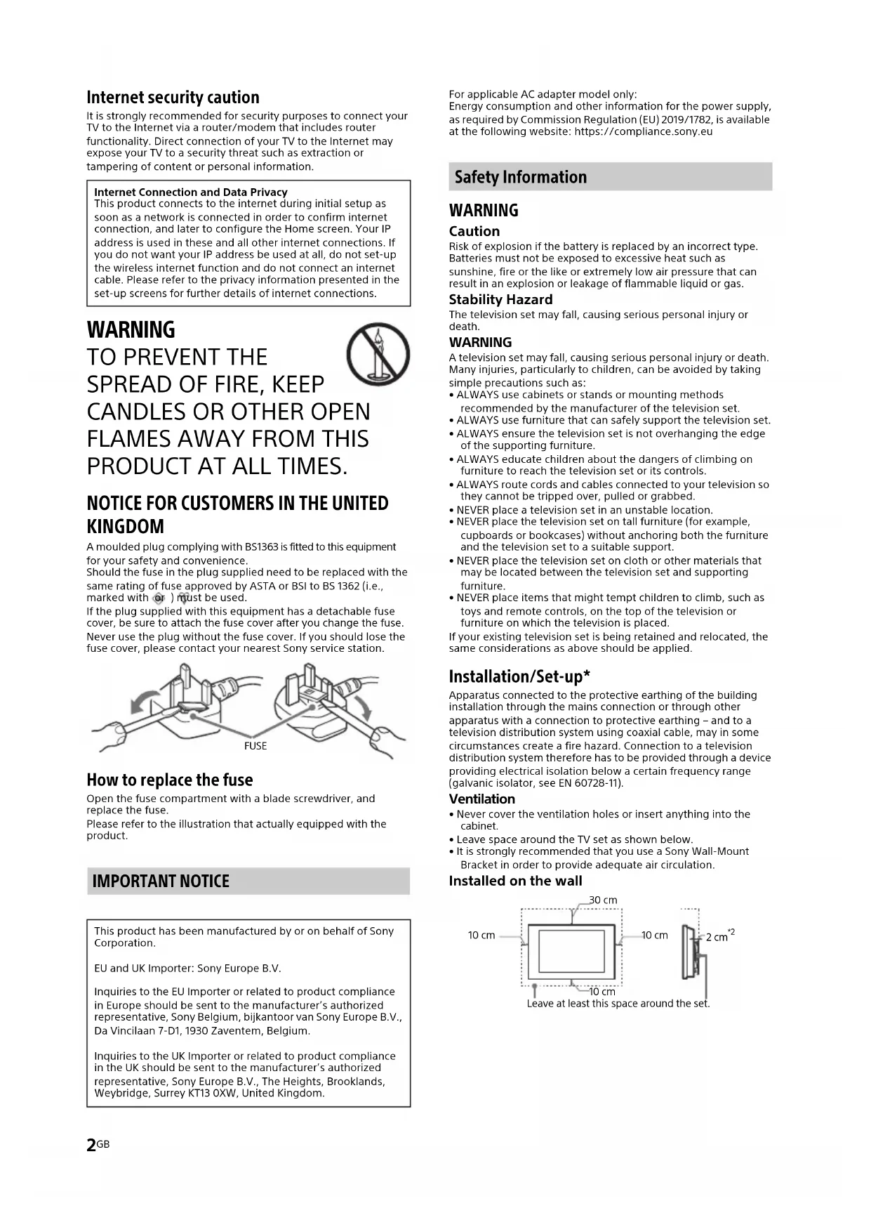 - It is strongly recommended that you use a Sony Wall-Mount Bracket in order to provide adequate air circulation. Installed on the wall Internet Connection and Data Privacy This product connects to the internet during initial setup as soon as a network is connected in order to confirm internet connection, and later to configure the Home screen. Your IP address is used in these and all other internet connections. If you do not want your IP address be used at all, do not set-up the wireless internet function and do not connect an internet cable. Please refer to the privacy information presented in the set-up screens for further details of internet connections. This product has been manufactured by or on behalf of Sony Corporation. EU and UK Importer: Sony Europe B.V. Inquiries to the EU Importer or related to product compliance in Europe should be sent to the manufacturer’s authorized representative, Sony Belgium, bijkantoor van Sony Europe B.V., Da Vincilaan 7-D1, 1930 Zaventem, Belgium. Inquiries to the UK Importer or related to product compliance in the UK should be sent to the manufacturer’s authorized representative, Sony Europe B.V., The Heights, Brooklands, Weybridge, Surrey KT13 0XW, United Kingdom. FUSE 30 cm 10 cm 2 cm