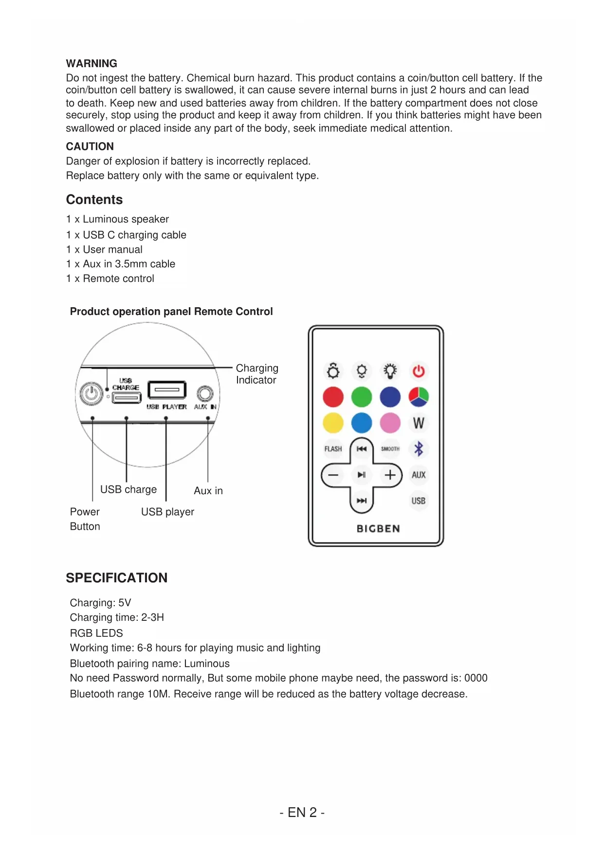 Contents 1 x Luminous speaker 1 x USB C charging cable 1 x User manual 1 x Aux in 3.5mm cable 1 x Remote control Product operation panel Remote Control Power Button USB charge USB player Aux in SPECIFICATION Charging: 5V Charging time: 2-3H RGB LEDS Working time: 6-8 hours for playing music and lighting Bluetooth pairing name: Luminous No need Password normally, But some mobile phone maybe need, the password is: 0000 Bluetooth range 10M. Receive range will be reduced as the battery voltage decrease. WARNING Do not ingest the battery. Chemical burn hazard. This product contains a coin/button cell battery. If the coin/button cell battery is swallowed, it can cause severe internal burns in just 2 hours and can lead to death. Keep new and used batteries away from children. If the battery compartment does not close securely, stop using the product and keep it away from children. If you think batteries might have been swallowed or placed inside any part of the body, seek immediate medical attention. CAUTION Danger of explosion if battery is incorrectly replaced. Replace battery only with the same or equivalent type. Charging Indicator- EN 3 - OPERATION Turn on/off the luminous speaker
