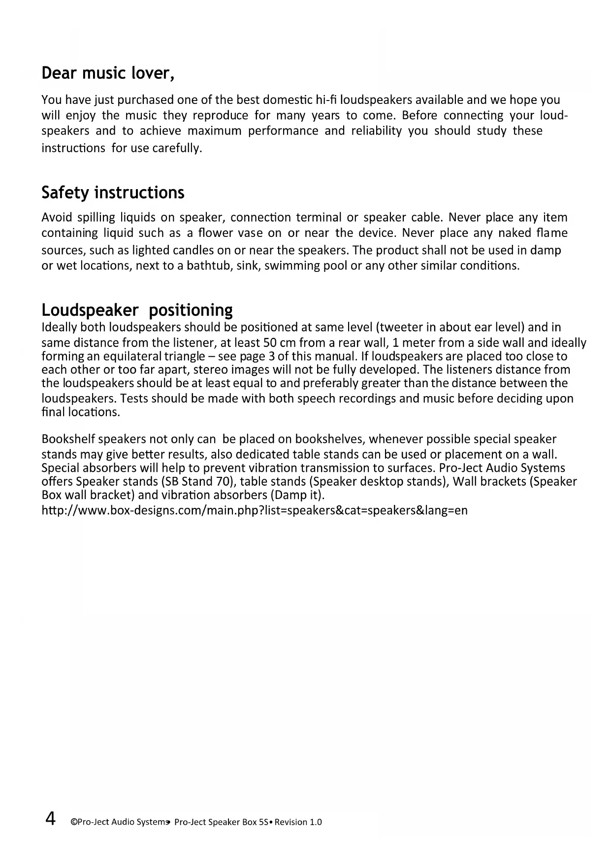 Dear music lover, You have just purchased one of the best domestic hi-fi loudspeakers available and we hope you will enjoy the music they reproduce for many years to come. Before connecting your loud- speakers and to achieve maximum performance and reliability you should study these instructions for use carefully. Safety instructions Avoid spilling liquids on speaker, connection terminal or speaker cable. Never place any item containing liquid such as a flower vase on or near the device. Never place any naked flame sources, such as lighted candles on or near the speakers. The product shall not be used in damp or wet locations, next to a bathtub, sink, swimming pool or any other similar conditions. Loudspeaker positioning Ideally both loudspeakers should be positioned at same level (tweeter in about ear level) and in same distance from the listener, at least 50 cm from a rear wall, 1 meter from a side wall and ideally forming an equilateral triangle – see page 3 of this manual. If loudspeakers are placed too close to each other or too far apart, stereo images will not be fully developed. The listeners distance from the loudspeakers should be at least equal to and preferably greater than the distance between the loudspeakers. Tests should be made with both speech recordings and music before deciding upon final locations. Bookshelf speakers not only can be placed on bookshelves, whenever possible special speaker stands may give better results, also dedicated table stands can be used or placement on a wall. Special absorbers will help to prevent vibration transmission to surfaces. Pro-Ject Audio Systems offers Speaker stands (SB Stand 70), table stands (Speaker desktop stands), Wall brackets (Speaker Box wall bracket) and vibration absorbers (Damp it). http://www.box-designs.com/main.php?list=speakers&cat=speakers&lang=en©Pro-Ject Audio Systems