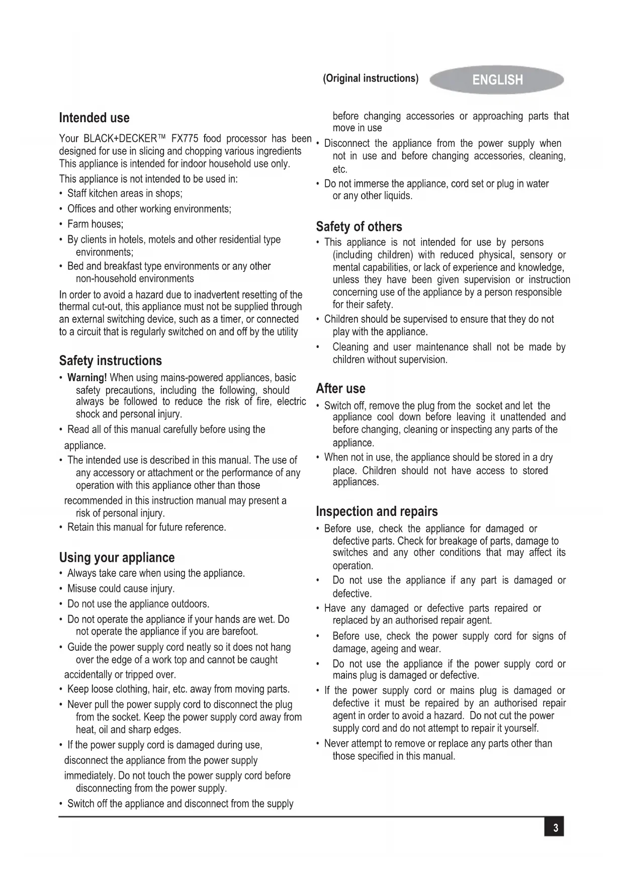ENGLISH (Original instructions) Intended use Your BLACK+DECKER™ FX775 food processor has been designed for use in slicing and chopping various ingredients This appliance is intended for indoor household use only. This appliance is not intended to be used in: