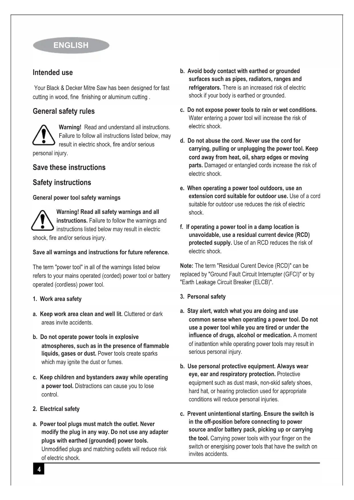 ENGLISH Intended use Your Black & Decker Mitre Saw has been designed for fast cutting in wood, fine finishing or aluminum cutting . General safety rules Warning! Read and understand all instructions. Failure to follow all instructions listed below, may result in electric shock, fire and/or serious personal injury. Save these instructions Safety instructions General power tool safety warnings Warning! Read all safety warnings and all instructions. Failure to follow the warnings and instructions listed below may result in electric shock, fire and/or serious injury. Save all warnings and instructions for future reference. The term "power tool" in all of the warnings listed below refers to your mains operated (corded) power tool or battery operated (cordless) power tool.