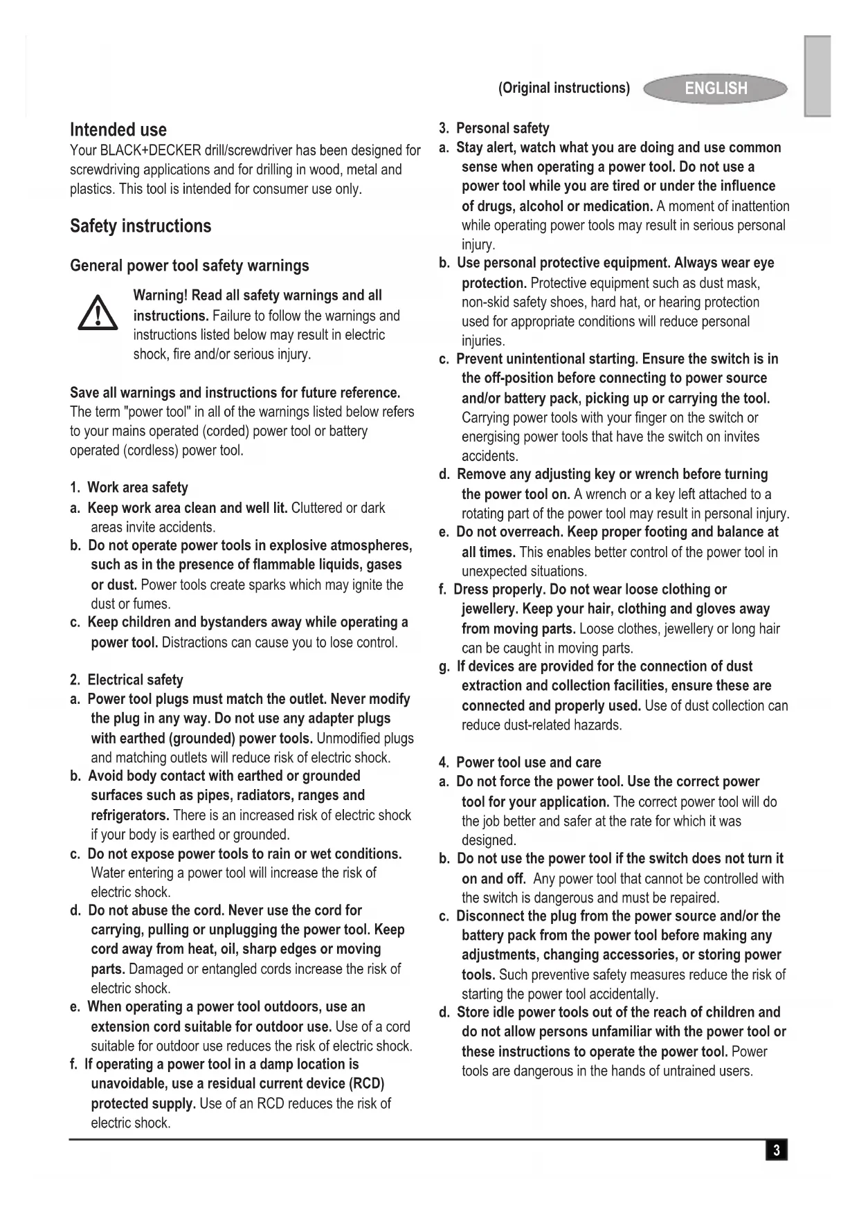 ENGLISH (Original instructions) Intended use Your BLACK+DECKER drill/screwdriver has been designed for screwdriving applications and for drilling in wood, metal and plastics. This tool is intended for consumer use only. Safety instructions General power tool safety warnings