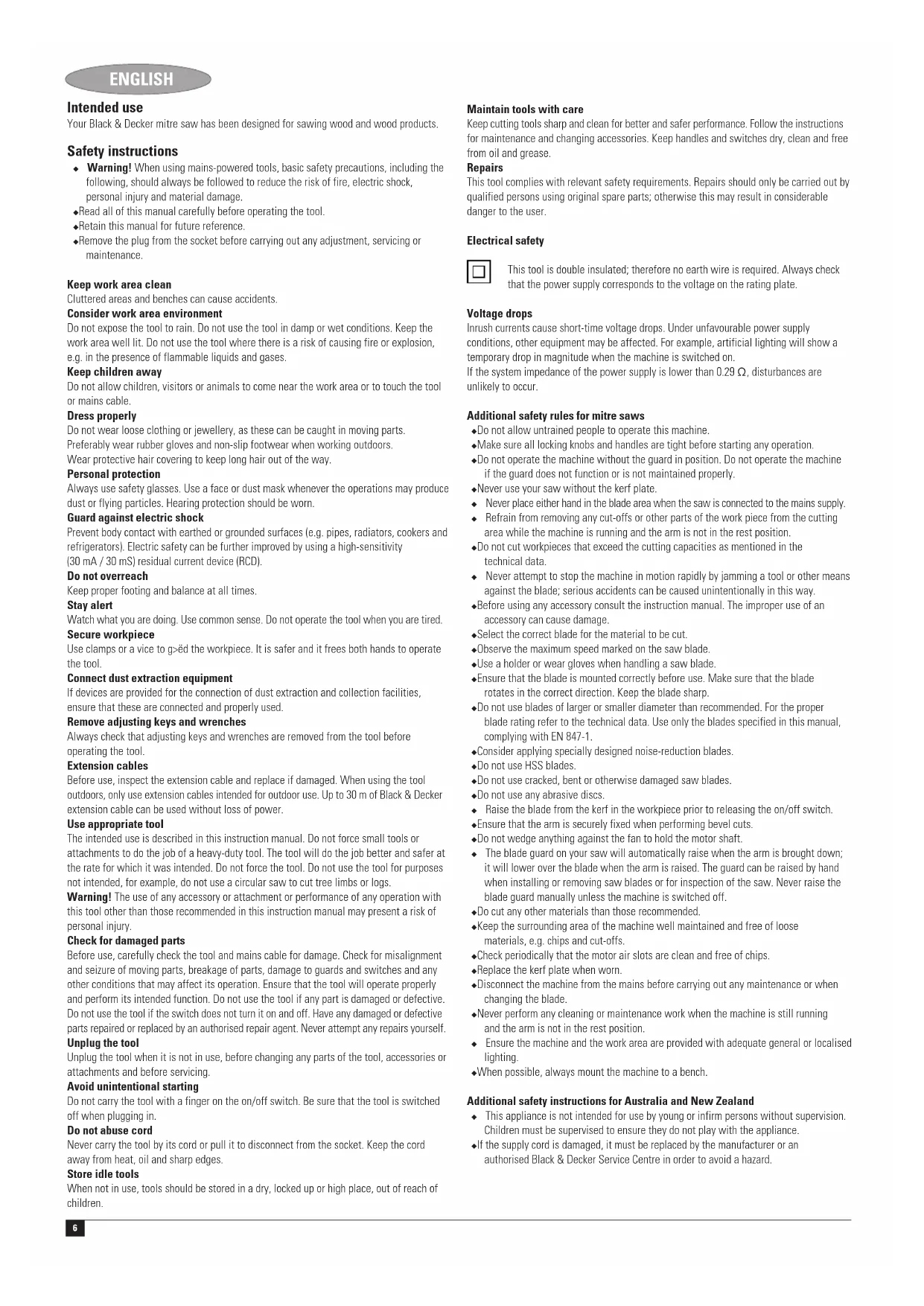 ENGLISH Intended use Your Black & Decker mitre saw has been designed for sawing wood and wood products. Safety instructions ◆ Warning! When using mains-powered tools, basic safety precautions, including the following, should always be followed to reduce the risk of fire, electric shock, personal injury and material damage. ◆ Read all of this manual carefully before operating the tool. ◆ Retain this manual for future reference. ◆ Remove the plug from the socket before carrying out any adjustment, servicing or maintenance. Keep work area clean Cluttered areas and benches can cause accidents. Consider work area environment Do not expose the tool to rain. Do not use the tool in damp or wet conditions. Keep the work area well lit. Do not use the tool where there is a risk of causing fire or explosion, e.g. in the presence of flammable liquids and gases. Keep children away Do not allow children, visitors or animals to come near the work area or to touch the tool or mains cable. Dress properly Do not wear loose clothing or jewellery, as these can be caught in moving parts. Preferably wear rubber gloves and non-slip footwear when working outdoors. Wear protective hair covering to keep long hair out of the way. Personal protection Always use safety glasses. Use a face or dust mask whenever the operations may produce dust or flying particles. Hearing protection should be worn. Guard against electric shock Prevent body contact with earthed or grounded surfaces (e.g. pipes, radiators, cookers and refrigerators). Electric safety can be further improved by using a high-sensitivity (30 mA / 30 mS) residual current device (RCD). Do not overreach Keep proper footing and balance at all times. Stay alert Watch what you are doing. Use common sense. Do not operate the tool when you are tired. Secure workpiece Use clamps or a vice to g>ëd the workpiece. It is safer and it frees both hands to operate the tool. Connect dust extraction equipment If devices are provided for the connection of dust extraction and collection facilities, ensure that these are connected and properly used. Remove adjusting keys and wrenches Always check that adjusting keys and wrenches are removed from the tool before operating the tool. Extension cables Before use, inspect the extension cable and replace if damaged. When using the tool outdoors, only use extension cables intended for outdoor use. Up to 30 m of Black & Decker extension cable can be used without loss of power. Use appropriate tool The intended use is described in this instruction manual. Do not force small tools or attachments to do the job of a heavy-duty tool. The tool will do the job better and safer at the rate for which it was intended. Do not force the tool. Do not use the tool for purposes not intended, for example, do not use a circular saw to cut tree limbs or logs. Warning! The use of any accessory or attachment or performance of any operation with this tool other than those recommended in this instruction manual may present a risk of personal injury. Check for damaged parts Before use, carefully check the tool and mains cable for damage. Check for misalignment and seizure of moving parts, breakage of parts, damage to guards and switches and any other conditions that may affect its operation. Ensure that the tool will operate properly and perform its intended function. Do not use the tool if any part is damaged or defective. Do not use the tool if the switch does not turn it on and off. Have any damaged or defective parts repaired or replaced by an authorised repair agent. Never attempt any repairs yourself. Unplug the tool Unplug the tool when it is not in use, before changing any parts of the tool, accessories or attachments and before servicing. Avoid unintentional starting Do not carry the tool with a finger on the on/off switch. Be sure that the tool is switched off when plugging in. Do not abuse cord Never carry the tool by its cord or pull it to disconnect from the socket. Keep the cord away from heat, oil and sharp edges. Store idle tools When not in use, tools should be stored in a dry, locked up or high place, out of reach of children. Maintain tools with care Keep cutting tools sharp and clean for better and safer performance. Follow the instructions for maintenance and changing accessories. Keep handles and switches dry, clean and free from oil and grease. Repairs This tool complies with relevant safety requirements. Repairs should only be carried out by qualified persons using original spare parts; otherwise this may result in considerable danger to the user. Electrical safety This tool is double insulated; therefore no earth wire is required. Always check that the power supply corresponds to the voltage on the rating plate. Voltage drops Inrush currents cause short-time voltage drops. Under unfavourable power supply conditions, other equipment may be affected. For example, artificial lighting will show a temporary drop in magnitude when the machine is switched on. If the system impedance of the power supply is lower than 0.29 ø, disturbances are unlikely to occur. Additional safety rules for mitre saws ◆ Do not allow untrained people to operate this machine. ◆ Make sure all locking knobs and handles are tight before starting any operation. ◆ Do not operate the machine without the guard in position. Do not operate the machine if the guard does not function or is not maintained properly. ◆ Never use your saw without the kerf plate. ◆ Never place either hand in the blade area when the saw is connected to the mains supply. ◆ Refrain from removing any cut-offs or other parts of the work piece from the cutting area while the machine is running and the arm is not in the rest position. ◆ Do not cut workpieces that exceed the cutting capacities as mentioned in the technical data. ◆ Never attempt to stop the machine in motion rapidly by jamming a tool or other means against the blade; serious accidents can be caused unintentionall