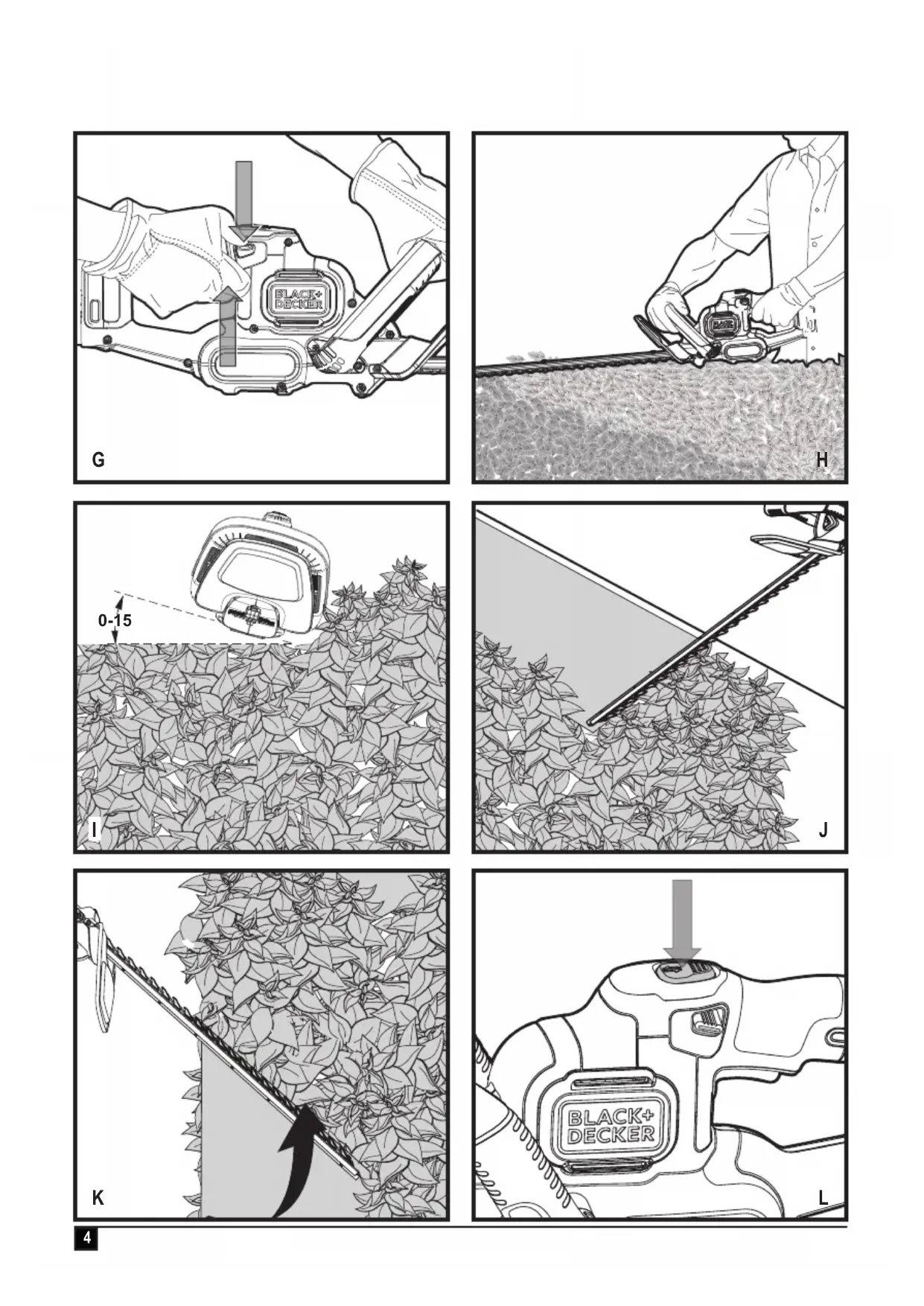 u The green LED will ash indicating that the battery is be- ing charged. u The completion of charge is indicated by the green LED remaining on continuously. The pack is fully charged and may be used at this time or left on the charger. Note: Recharge discharged batteries as soon as possible after use or battery life may be greatly diminished. For longest battery life, do not discharge batteries fully. It is recommended that the batteries be recharged after each use. Leaving the battery in the charger The charger and battery pack can be left connected with the LED glowing indenitely. The charger will keep the battery pack fresh and fully charged. Important charging notes u Longest life and best performance can be obtained if the battery pack is charged when the air temperature is between 65°F and 75°F (18°- 24°C). DO NOT charge the battery pack in an air temperature below +40°F (+4.5°C), or above +105°F (+40.5°C). This is important and will prevent serious damage to the battery pack. u The charger and battery pack may become warm to touch while charging. This is a normal condition, and does not indicate a problem. To facilitate the cooling of the battery pack after use, avoid placing the charger or battery pack in a warm environment such as in a metal shed, or an uninsulated trailer. u If the battery pack does not charge properly: u Check current at receptacle by plugging in a lamp or other appliance. u Check to see if receptacle is connected to a light switch which turns power off when you turn out the lights. u Move charger and battery pack to a location where the surrounding air temperature is approximately 65°F - 75°F (18°- 24°C). u If charging problems persist, take the tool, battery pack and charger to your local service center. u The battery pack should be recharged when it fails to produce sufcient power on jobs which were easily done previously. DO NOT CONTINUE to use under these conditions. Follow the charging procedure. You may also charge a partially used pack whenever you desire with no adverse affect on the battery pack. u Foreign materials of a conductive nature such as, but not limited to, steel wool, aluminium foil, or any buildup of metallic particles should be kept away from charger cavities. Always unplug the charger from the power supply when there is no battery pack in the cavity. Unplug charger before attempting to clean. u Do not freeze or immerse charger in water or any other liquid. Warning! Do not allow any liquid to get inside charger. Never attempt to open the battery pack for any reason. If the plastic housing of the battery pack breaks or cracks, return to a service center for recycling. Installing and removing the battery pack from the tool Warning! Make certain the lock-off button is engaged to prevent switch actuation before removing or installing battery. To install battery pack u Insert battery (8) into tool until an audible click is heard (Figure. B) u Ensure battery pack is fully seated and fully latched into position.9 ENGLISH (Original instructions) To remove battery pack u Depress the battery release button as shown in gure C and pull battery pack out of tool. Assembly instructions Warning! Make certain the battery is removed before assem- bly or disassembly of any parts. Assembly tools required (not supplied):- phillips screw- driver. Attaching guard and bail handle to trimmer Warning! Only use with handle and guard properly assembled to hedge trimmer. The use of the hedge trimmer without the proper guard or handle provided may result in serious personal injury. The trimmer is shipped with the guard and bail handle at- tached with a plastic zip tie. To assemble to trimmer: u Cut the plastic zip tie. u Remove the six screws that are partially run into the trim- mer housing (Figure D). u Slide the guard (5) onto the front of the trimmer housing as shown in gure E u Insert two of the six screws into the openings on the sides of the guard and tighten securely. u Slide the bail handle (6) onto the front of the trimmer hous- ing behind the guard as shown in gure F. u Insert the remaining four screws into the openings on the sides of the bail handle and tighten securely. Operation u To turn the unit on, push the lock off button (2) down, squeeze the trigger (1) and depress the dual switch bail handle(6), as shown in gure G. Once the unit is running, you may release the lock-off button. In order to keep the unit running you must continue to squeeze the trigger. Warning! Never attempt to lock a switch in the on position. Trimming Instructions u Maintain proper footing and balance and do not overreach. Wear safety goggles, non-skid footwear when trimming. Hold the unit rmly in both hands and turn the unit ON. Always hold the trimmer, as shown in the illustrations in this manual, with one hand on the switch handle and one hand on the bail handle (gure H). Never hold the unit by the blade guard. Trimming new growth (Fig. I) u A wide, sweeping motion, feeding the blade teeth through the twigs is most effective. A slight downward tilt of the blade, in the direction of motion gives the best cutting. Warning! Do not cut stems greater than 19mm. Use the trimmer only for cutting normal shrubbery around houses and buildings. Level hedges (Fig. J) u To obtain exceptionally level hedges a piece of string can be stretched along the length of the hedge as a guide. Side trimming hedges (Fig. K) u Hold the trimmer as shown and begin at the bottom and sweep up. POWERCOMMAND If you encounter a jam, depress the POWERCOMMAND button (4) shown in gure l. The blades will move back and forth in a slower, more forceful rhythm to help cut through dif- cult branches. Release the button to return to normal hedge trimming usage. Note: Once the button is released, the blades will immediately return to full speed. Note: The blades will stop when the button is held for 15 sec- onds. To reengage the POWERCOMMAND feature, release the button and depress it again. DO NOT continuo
