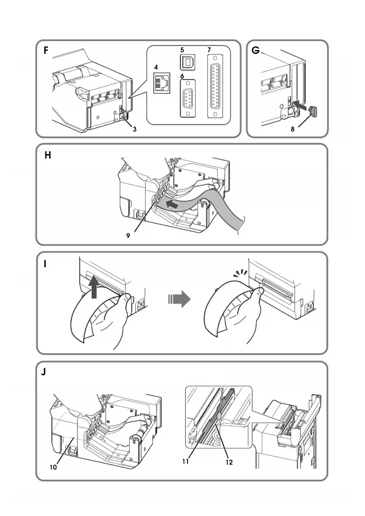 printer to exit the test printing or press the Unload ( ↑ ) button again to restart the test printing. The test printing is completed when "*** completed***” is printed. Cleaning Cleaning the Printer Case Be sure to turn off the printer, and wipe the dirt off the printer case with a dry cloth or a damp cloth. CAUTION: Never clean the product with alcohol, benzine, thinner, or other such solvents. Doing so may damage or break the parts made of plastic and rubber. Cleaning the Paper path, the Head plate, and the Thermal Head After the printer is used for a long period, the glue from the labels accumulates in the paper path (10 in illustration J), and on the head plate (11 in illustration J) and the thermal head (12 in illustration J). If you leave them in such a condition, the glue may stick to issued labels, or a paper jam may occur. To prevent malfunctions and maintain good print quality, clean the paper path, the head plate, and the thermal head regularly (generally every month). CAUTION: The thermal head can be very hot after printing. Be careful not to touch it, and let it cool before you clean it. Do not damage the thermal head by touching it with your fingers or any hard object.