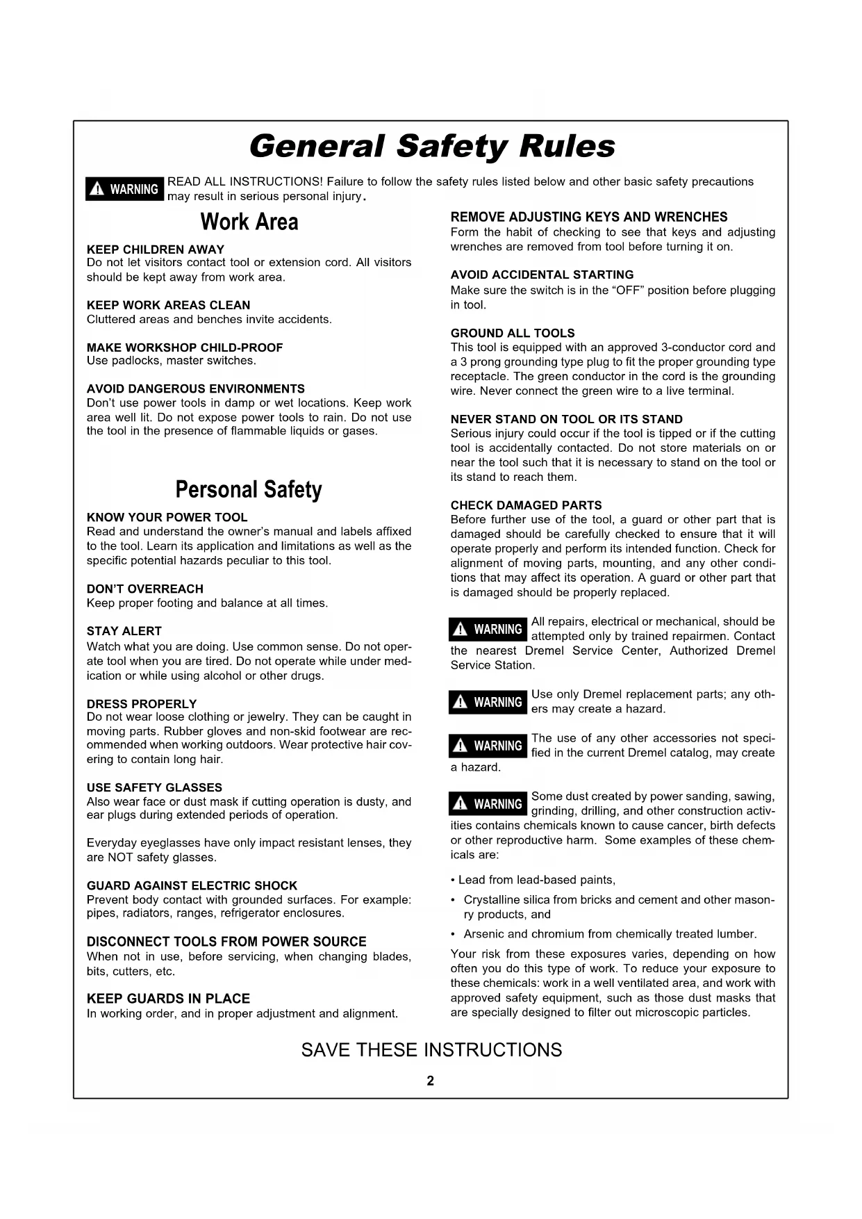 Before further use of the tool, a guard or other part that is damaged should be carefully checked to ensure that it will operate properly and perform its intended function. Check for alignment of moving parts, mounting, and any other condi- tions that may affect its operation. A guard or other part that is damaged should be properly replaced. All repairs, electrical or mechanical, should be attempted only by trained repairmen. Contact the nearest Dremel Service Center, Authorized Dremel Service Station. Use only Dremel replacement parts; any oth- ers may create a hazard. The use of any other accessories not speci- fied in the current Dremel catalog, may create a hazard. Some dust created by power sanding, sawing, grinding, drilling, and other construction activ- ities contains chemicals known to cause cancer, birth defects or other reproductive harm. Some examples of these chem