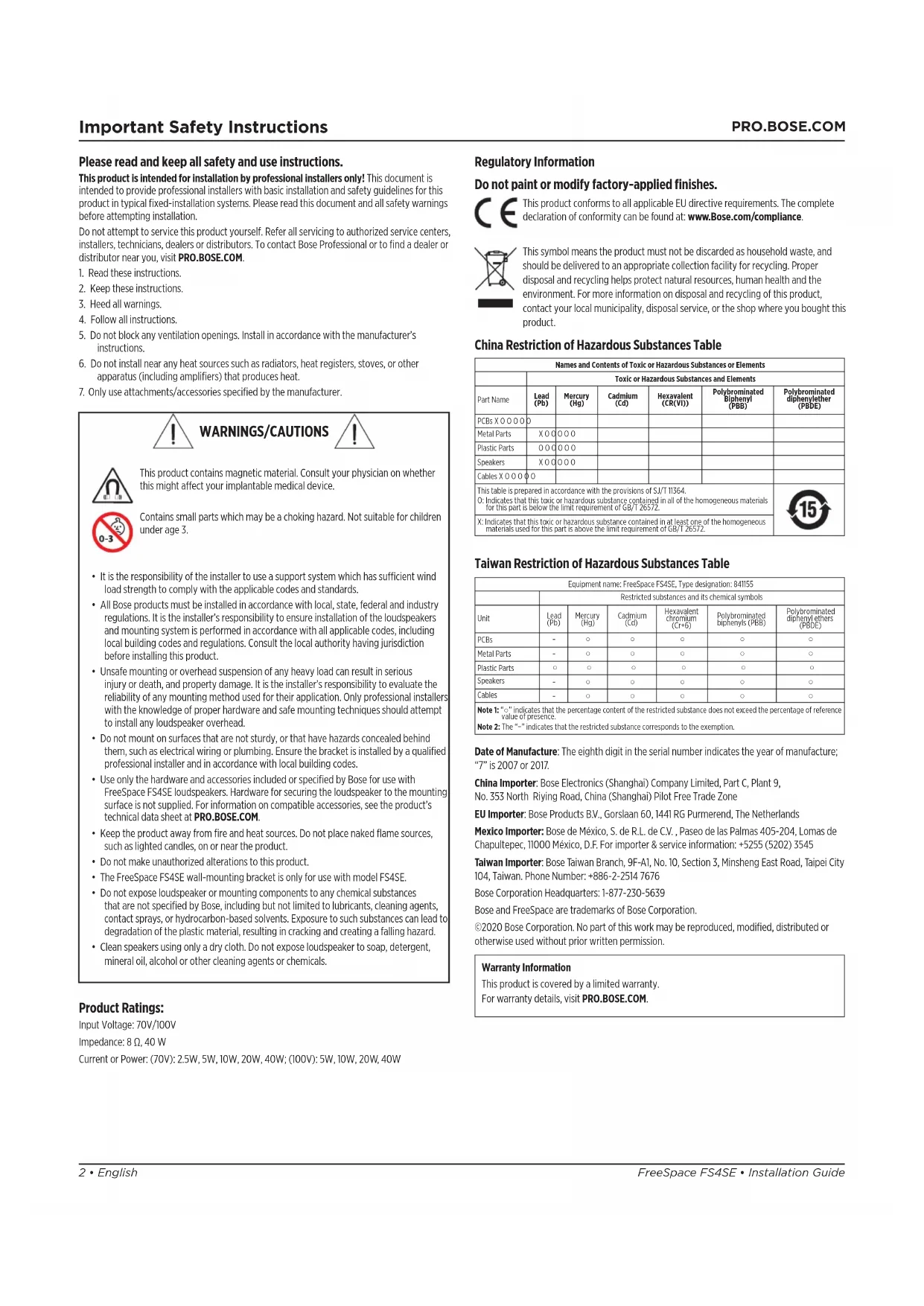 - Clean speakers using only a dry cloth. Do not expose loudspeaker to soap, detergent, mineral oil, alcohol or other cleaning agents or chemicals. Regulatory Information Do not paint or modify factory-applied finishes. This product conforms to all applicable EU directive requirements. The complete declaration of conformity can be found at: www.Bose.com/compliance. This symbol means the product must not be discarded as household waste, and should be delivered to an appropriate collection facility for recycling. Proper disposal and recycling helps protect natural resources, human health and the environment. For more information on disposal and recycling of this product, contact your local municipality, disposal service, or the shop where you bought this product. China Restriction of Hazardous Substances Table Names and Contents of Toxic or Hazardous Substances or Elements Toxic or Hazardous Substances and Elements Part Name Lead (Pb) Mercury (Hg) Cadmium (Cd) Hexavalent (CR(VI)) Polybrominated Biphenyl (PBB) Polybrominated diphenylether (PBDE) PCBs X O O O O O Metal Parts X O O O O O Plastic Parts O O O O O O Speakers X O O O O O Cables X O O O O O This table is prepared in accordance with the provisions of SJ/T 11364. O: Indicates that this toxic or hazardous substance contained in all of the homogeneous materials for this part is below the limit requirement of GB/T 26572. X: Indicates that this toxic or hazardous substance contained in at least one of the homogeneous materials used for this part is above the limit requirement of GB/T 26572. Taiwan Restriction of Hazardous Substances Table Equipment name: FreeSpace FS4SE, Type designation: 841155 Restricted substances and its chemical symbols Unit Lead (Pb) Mercury (Hg) Cadmium (Cd) Hexavalent chromium (Cr+6) Polybrominated biphenyls (PBB) Polybrominated diphenyl ethers (PBDE) PCBs - ○ ○ ○ ○ ○ Metal Parts - ○ ○ ○ ○ ○ Plastic Parts ○ ○ ○ ○ ○ ○ Speakers - ○ ○ ○ ○ ○ Cables - ○ ○ ○ ○ ○ Note 1: “○” indicates that the percentage content of the restricted substance does not exceed the percentage of reference value of presence. Note 2: The “−” indicates that the restricted substance corresponds to the exemption. Date of Manufacture: The eighth digit in the serial number indicates the year of manufacture; “7” is 2007 or 2017. China Importer: Bose Electronics (Shanghai) Company Limited, Part C, Plant 9, No. 353 North Riying Road, China (Shanghai) Pilot Free Trade Zone EU Importer: Bose Products B.V., Gorslaan 60, 1441 RG Purmerend, The Netherlands Mexico Importer: Bose de México, S. de R.L. de C.V. , Paseo de las Palmas 405-204, Lomas de Chapultepec, 11000 México, D.F. For importer & service information: +5255 (5202) 3545 Taiwan Importer: Bose Taiwan Branch, 9F-A1, No. 10, Section 3, Minsheng East Road, Taipei City 104, Taiwan. Phone Number: +886-2-2514 7676 Bose Corporation Headquarters: 1-877-230-5639 Bose and FreeSpace are trademarks of Bose Corporation. ©2020 Bose Corporation. No part of this work may be reproduced, modified, distributed or otherwise used without prior written permission. Warranty Information This product is covered by a limited warranty. For warranty details, visit PRO.BOSE.COM. Product Ratings: Input Voltage: 70V/100V Impedance: 8 Ω, 40 W Current or Power: (70V): 2.5W, 5W, 10W, 20W, 40W; (100V): 5W, 10W, 20W, 40WEnglish • 3Installation Guide • FreeSpace FS4SE