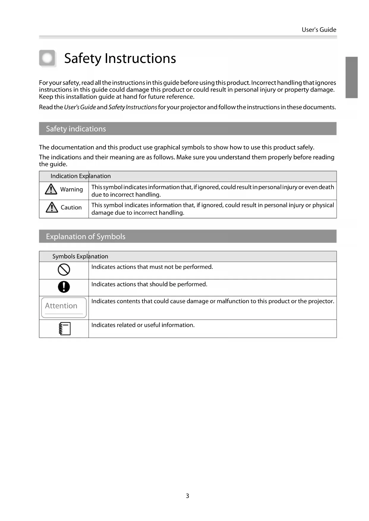 Safety Instructions For your safety, read all the instructions in this guide before using this product. Incorrect handling that ignores instructions in this guide could damage this product or could result in personal injury or property damage. Keep this installation guide at hand for future reference. Read the User's Guide and Safety Instructions for your projector and follow the instructions in these documents. Safety indications The documentation and this product use graphical symbols to show how to use this product safely. The indications and their meaning are as follows. Make sure you understand them properly before reading the guide. Indication Explanation Warning This symbol indicates information that, if ignored, could result i n per so na l i nju ry or ev en de at h due to incorrect handling. Caution This symbol indicates information that, if ignored, could result in personal injury or physical damage due to incorrect handling. Explanation of Symbols Symbols Explanation Indicates actions that must not be performed. Indicates actions that should be performed. Attention Indicates contents that could cause damage or malfunction to this product or the projector.