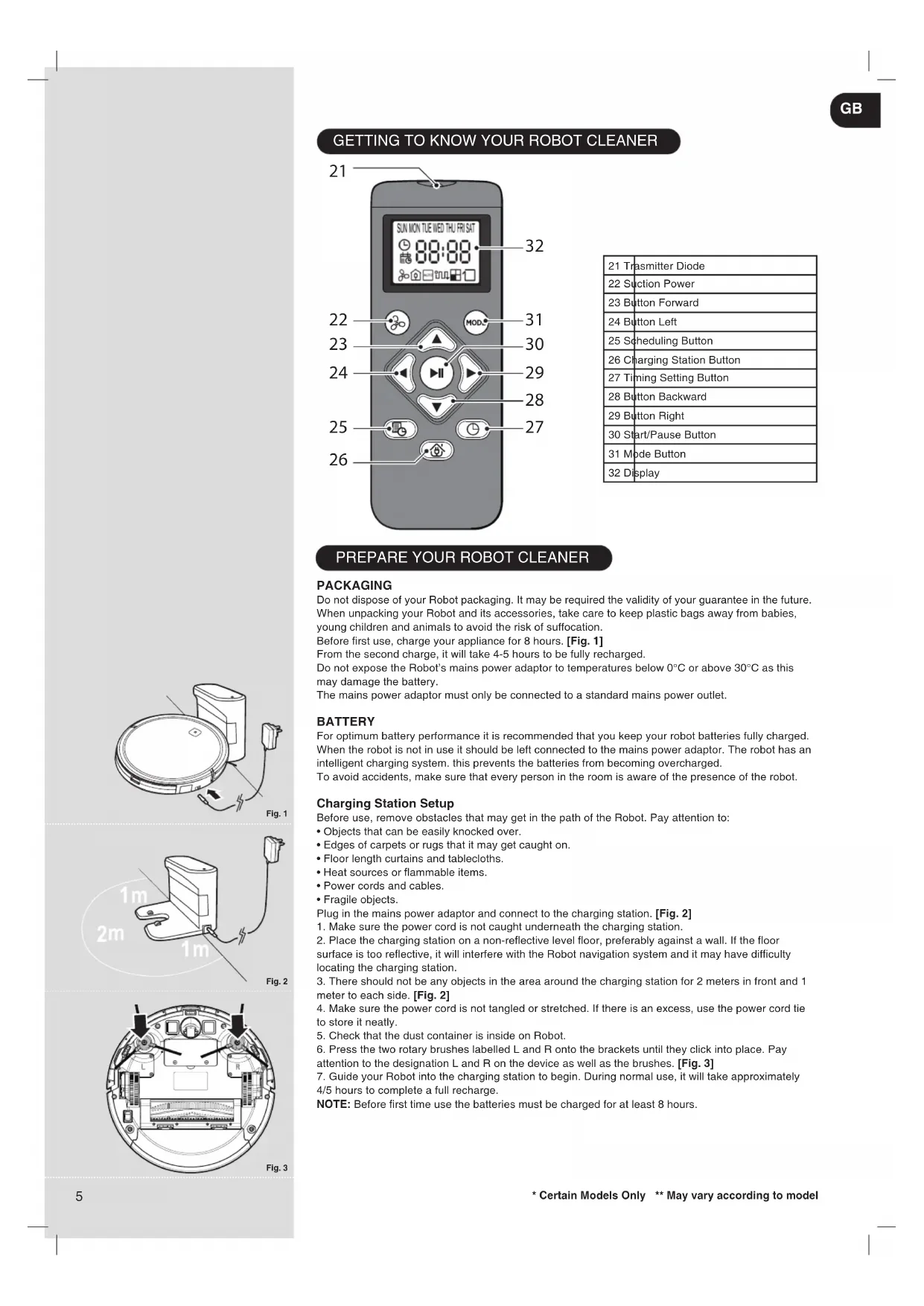 - Certain Models Only ** May vary according to model Fig. 5Fig. 4Fig. 7Fig. 6Fig. 8Fig. 9Fig. 11Fig. 10 GB7 MAX Setting up the Cleaning Schedule [Fig. 12] Press the schedule button. Press the Left/Right buttons to select a day. Press the Up/Down buttons to select or deselect that day, several days can be selected. When all required days are selected, Press the Play/Pause button to set. The hours will then start ashing. Set the time you want to start the scheduled cleaning. Press the Up/ Down buttons to set the hours. Press the Play/Pause button to set the hours. The minutes will then start ashing. Press the Up/Down buttons to set the minutes. Press the Play/Pause button to set the minutes. An audible signal is given from the robot signifying that the schedule has been set. If the audible signal is not given, Press the ‘AUTO’ button on the robot, then press the schedule button on the remote control. The LED of the control lamp ashes. At the set time, the cleaning process starts. To deactivate the start time, press the Schedule button for approx. 3 seconds. The Schedule symbol in the display of the remote control turns off. Setting Power Level Press POWER LEVEL button on the remote control to select the desired power level. Choose between Normal Power and Turbo Power . Setting Cleaning Mode AUTO : Press the on/ standby button on the device or the start/ pause button on the remote control to start the cleaning process. Robot will automatically choose the best cleaning mode to clean you room. PARALLEL: Press MODE button on the remote control for the robot to start cleaning under this mode . SPOT: Press MODE button on the remote control. It cleans a intensively conned area following a circular path . EDGE: Press MODE button on the remote control, It will automatically start cleaning along walls, around furniture etc . MANUAL: the robot can be controlled using the arrows on the remote control. RETURN TO BASE: Press the button on the remote control to send the robot to the charging base. This mode can be activated during any cleaning cycle and the robot will automatically return to the charging base. When a cleaning cycle has been completed or the robot’s battery is low, the robot will also return to the charging base automatically.