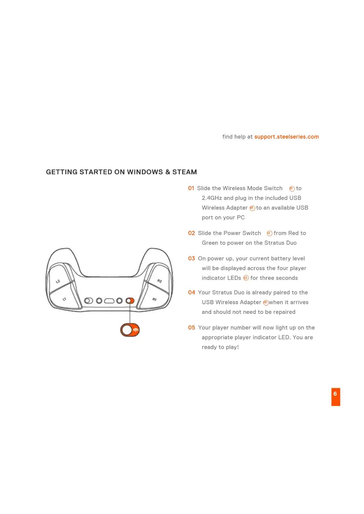 for three seconds 04 All four LEDs will flash On and Off rapidly when the controller is in pairing mode 05 To pair the Stratus Duo, go to your Bluetooth Control Panel on your intended device and connect SteelSeries Stratus Duo 06 If the controller has paired successfully, the four player indicator LEDs will flicker ON/OFF every 2 seconds to indicate Connected Status. You are now ready to play!8 find help at support.steelseries.com Your Stratus Duo will remember the last device that it connected to via Bluetooth and automatically repair. If you would like to force the Stratus Duo to re-enter pairing mode: 01 Press the Wireless Pairing Button