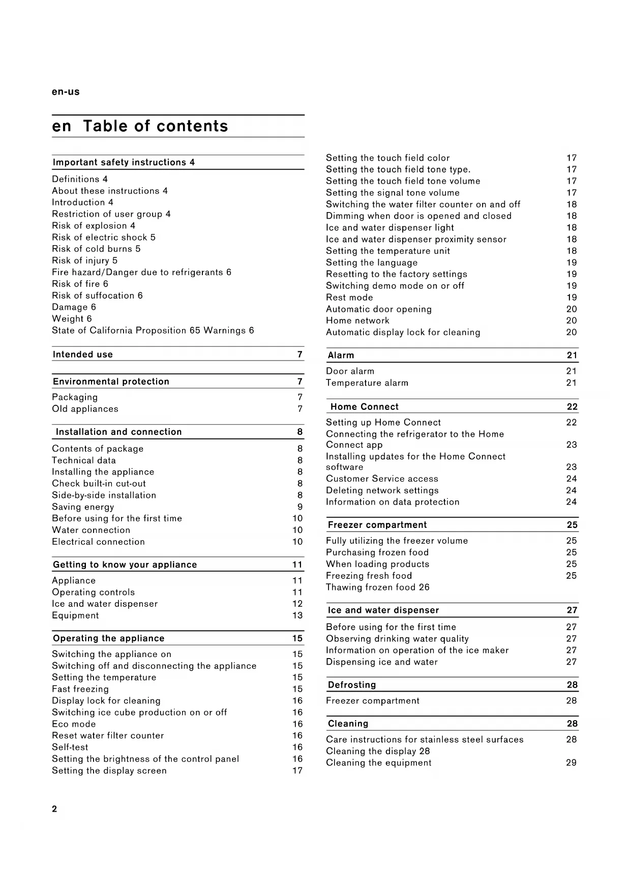 Operating the appliance 15 Switching the appliance on 15 Switching off and disconnecting the appliance 15 Setting the temperature 15 Fast freezing 15 Display lock for cleaning 16 Switching ice cube production on or off 16 Eco mode 16 Reset water filter counter 16 Self-test 16 Setting the brightness of the control panel 16 Setting the display screen 17 Setting the touch field color 17 Setting the touch field tone type. 17 Setting the touch field tone volume 17 Setting the signal tone volume 17 Switching the water filter counter on and off 18 Dimming when door is opened and closed 18 Ice and water dispenser light 18 Ice and water dispenser proximity sensor 18 Setting the temperature unit 18 Setting the language 19 Resetting to the factory settings 19 Switching demo mode on or off 19 Rest mode 19 Automatic door opening 20 Home network 20 Automatic display lock for cleaning 20