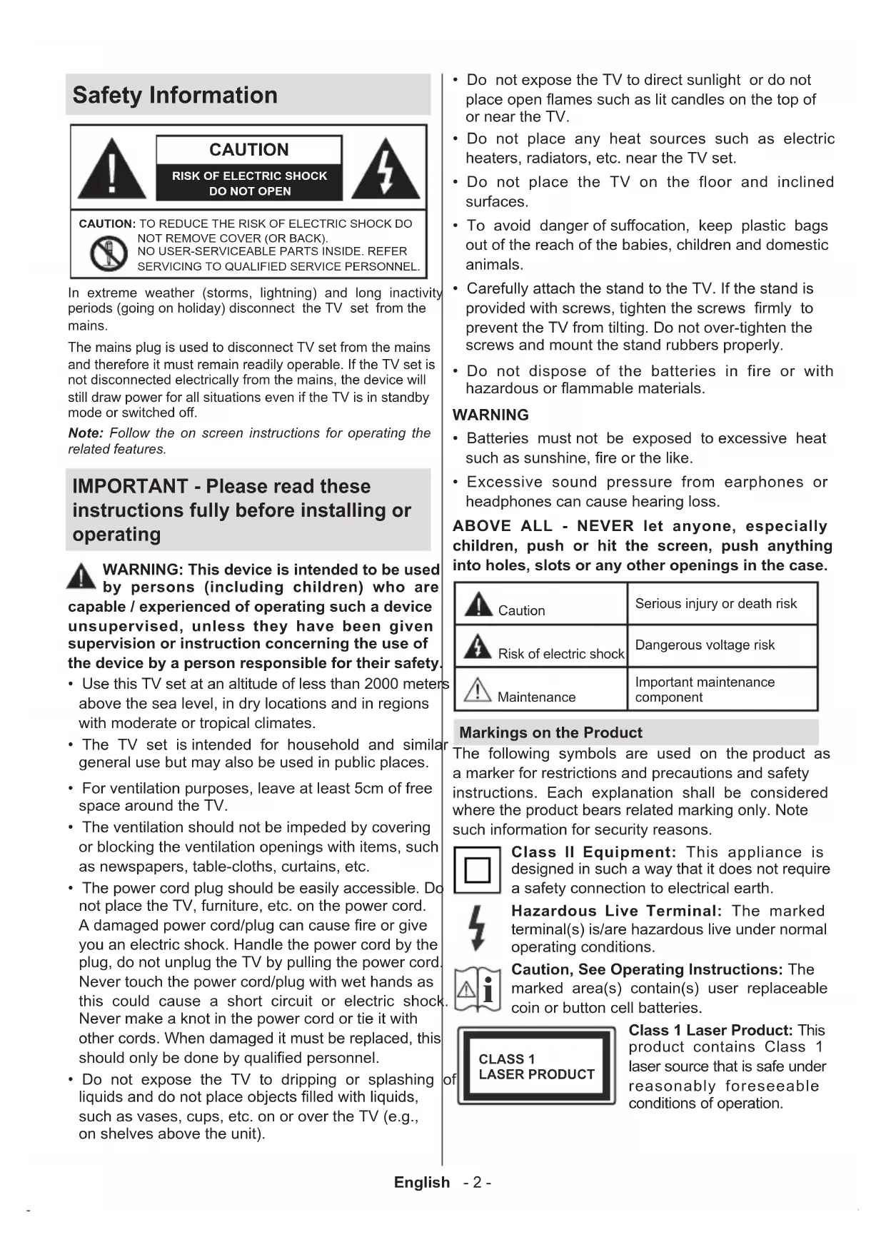 - Excessive sound pressure from earphones or headphones can cause hearing loss. ABOVE ALL - NEVER let anyone, especially children, push or hit the screen, push anything into holes, slots or any other openings in the case. Caution Serious injury or death risk Risk of electric shock Dangerous voltage risk MaintenanceImportant maintenance component Markings on the Product The following symbols are used on the product as a marker for restrictions and precautions and safety instructions. Each explanation shall be considered where the product bears related marking only. Note such information for security reasons. Class II Equipment: This appliance is designed in such a way that it does not require a safety connection to electrical earth. Hazardous Live Terminal: The marked terminal(s) is/are hazardous live under normal operating conditions.
