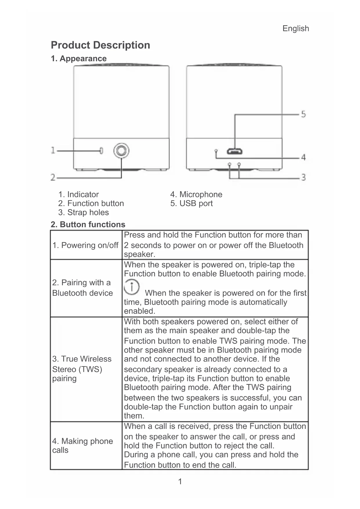 Stereo (TWS) pairing With both speakers powered on, select either of them as the main speaker and double-tap the Function button to enable TWS pairing mode. The other speaker must be in Bluetooth pairing mode and not connected to another device. If the secondary speaker is already connected to a device, triple-tap its Function button to enable Bluetooth pairing mode. After the TWS pairing between the two speakers is successful, you can double-tap the Function button again to unpair them.