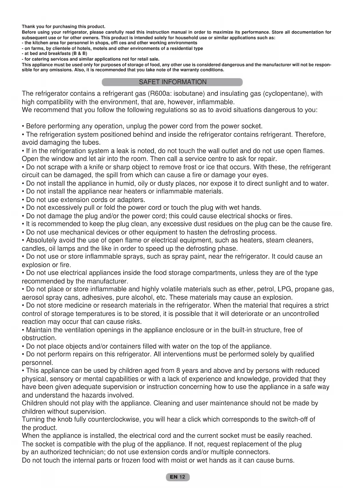 Thank you for purchasing this product. Before using your refrigerator, please carefully read this instruction manual in order to maximize its performance. Store all documentation for subsequent use or for other owners. This product is intended solely for household use or similar applications such as: - the kitchen area for personnel in shops, offi ces and other working environments - on farms, by clientele of hotels, motels and other environments of a residential type - at bed and breakfasts (B & B) - for catering services and similar applications not for retail sale. This appliance must be used only for purposes of storage of food, any other use is considered dangerous and the manufacturer will not be respon- sible for any omissions. Also, it is recommended that you take note of the warranty conditions. The refrigerator contains a refrigerant gas (R600a: isobutane) and insulating gas (cyclopentane), with high compatibility with the environment, that are, however, inflammable. We recommend that you follow the following regulations so as to avoid situations dangerous to you: