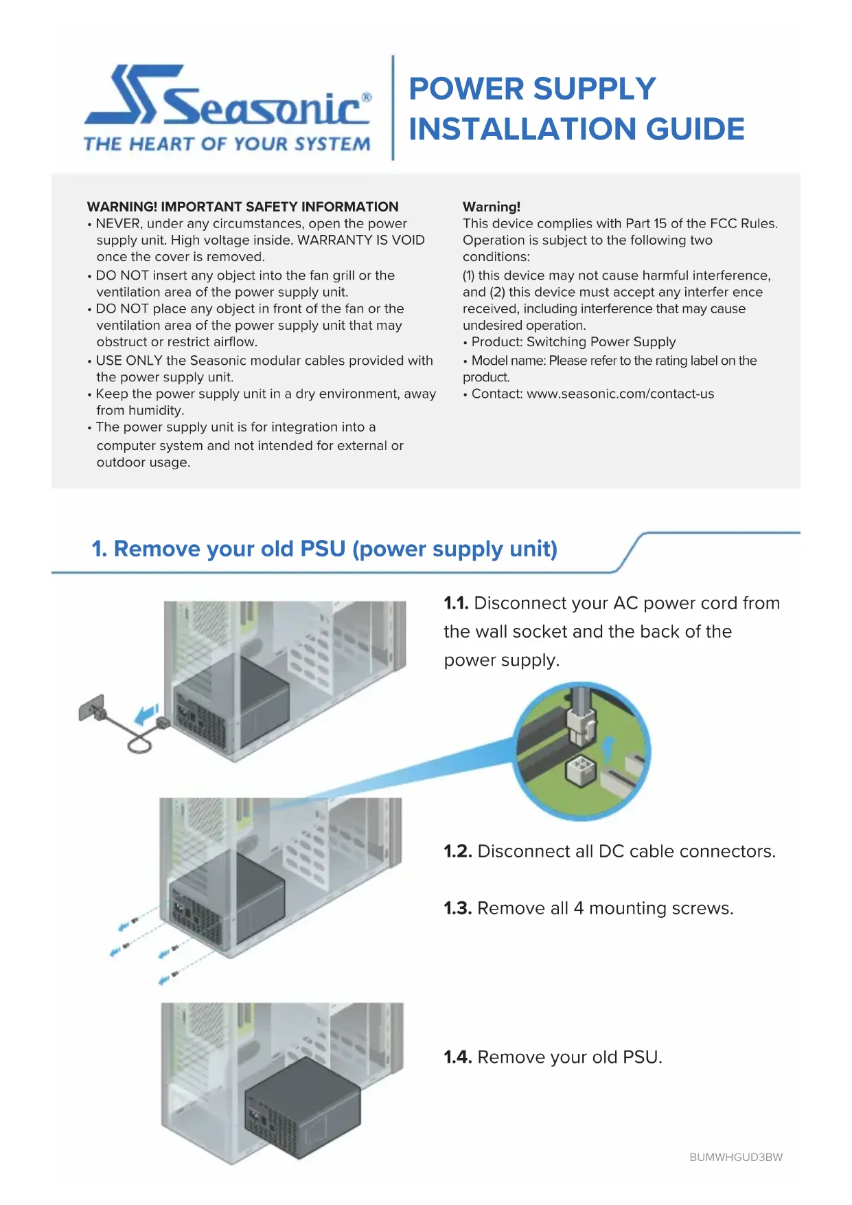 - Contact: www.seasonic.com/contact-us BUMWHGUD3BWThe drawings illustrate a fully modular PSU with a fan control switch and a Power Supply Tester; the features and accessories of your PSU might be dierent. 2.1. Plug the AC power cord into the PSU. Make sure that the AC power is coming directly from the wall outlet. 2.3. If your power supply features a fan control switch, set it to “Normal” Mode*.