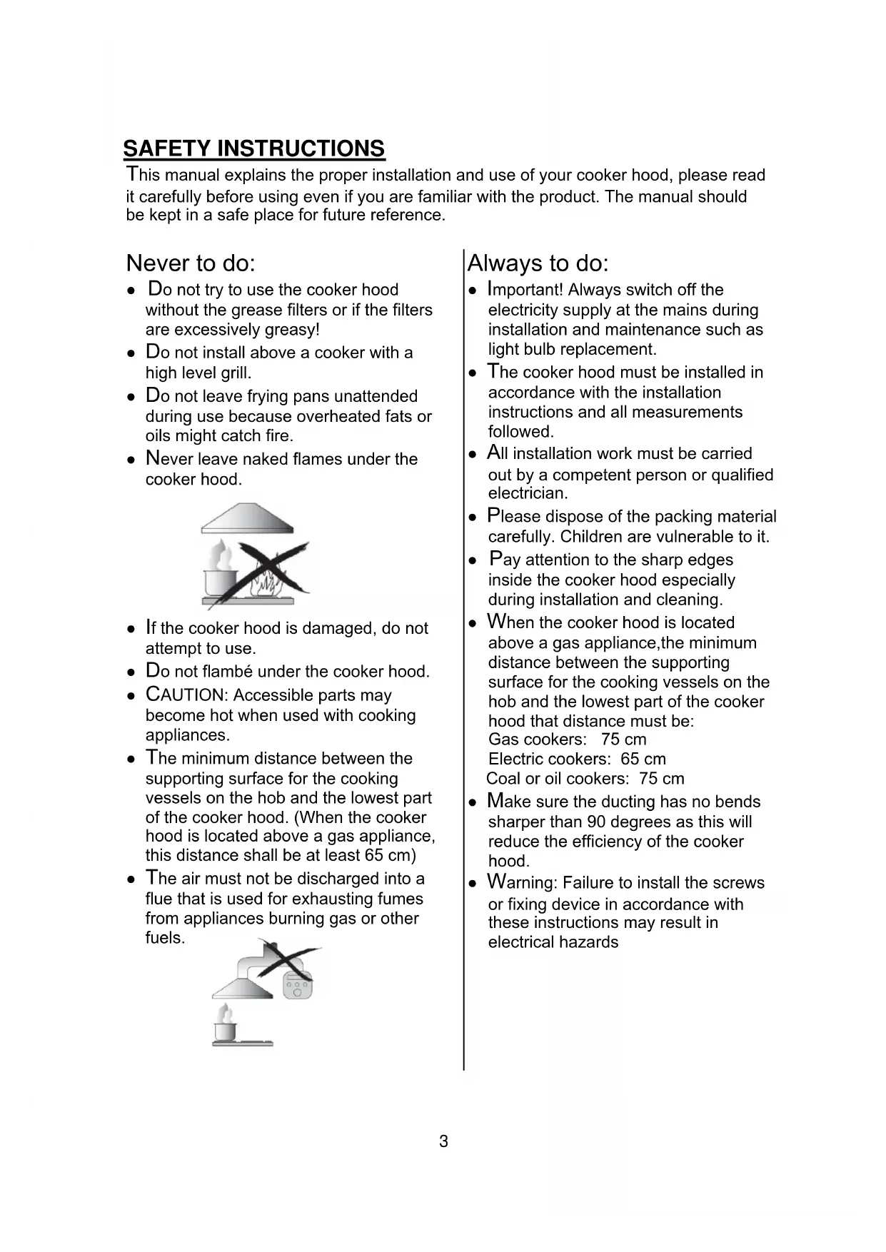 2SAFETY INSTRUCTIONS This manual explains the proper installation and use of your cooker hood, please read it carefully before using even if you are familiar with the product. The manual should be kept in a safe place for future reference. Never to do: ● Do not try to use the cooker hood without the grease filters or if the filters are excessively greasy! ● Do not install above a cooker with a high level grill. ● Do not leave frying pans unattended during use because overheated fats or oils might catch fire. ● Never leave naked flames under the cooker hood. ● If the cooker hood is damaged, do not attempt to use. ● Do not flambé under the cooker hood. ● CAUTION: Accessible parts may become hot when used with cooking appliances. ● The minimum distance between the supporting surface for the cooking vessels on the hob and the lowest part of the cooker hood. (When the cooker hood is located above a gas appliance, this distance shall be at least 65 cm) ● The air must not be discharged into a flue that is used for exhausting fumes from appliances burning gas or other fuels.