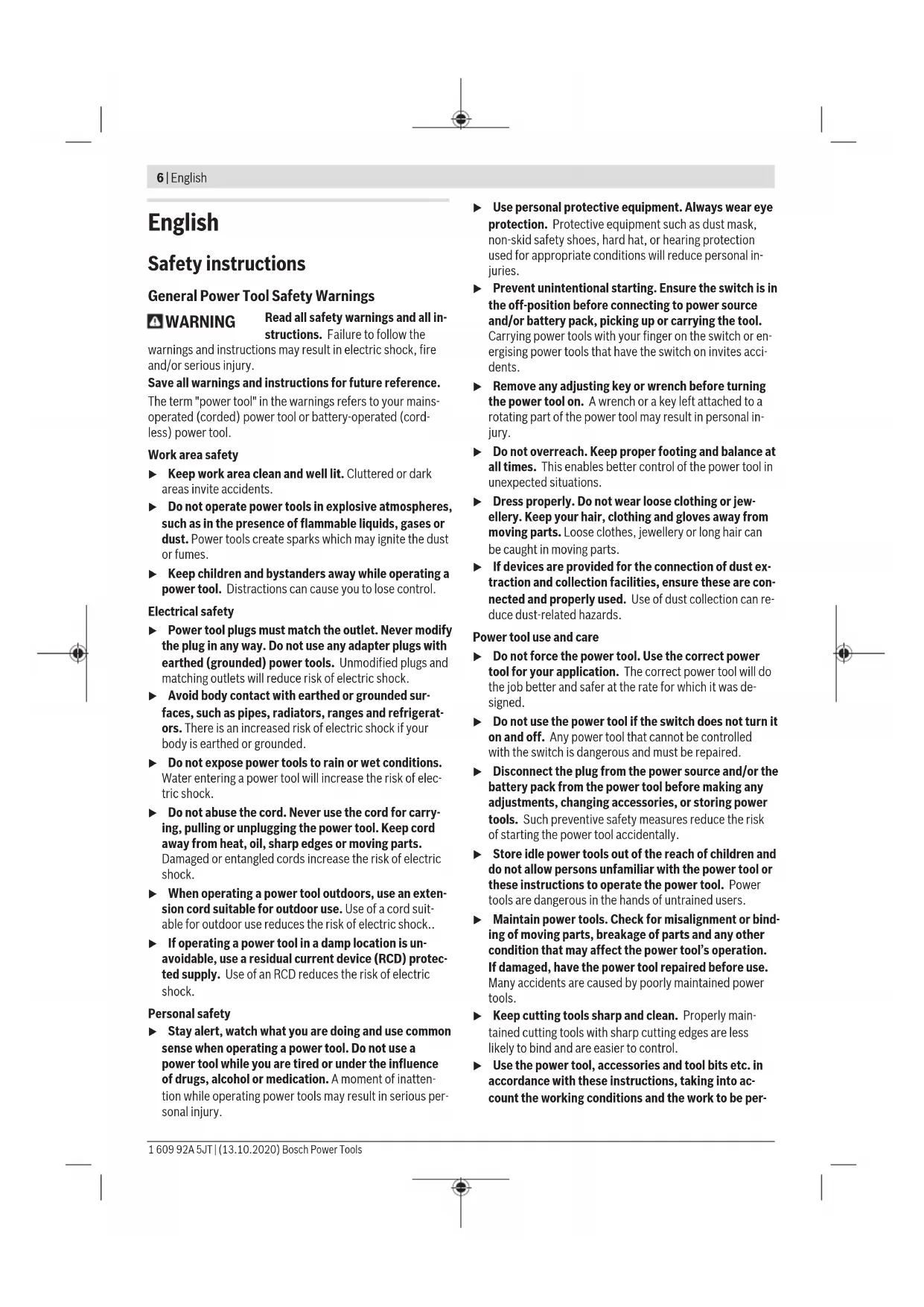 (5) (22) (21) (19) (22) (21) (23) (7) (25) (24) (27) (26) (29) (28) Bosch Power Tools 1 609 92A 5JT | (13.10.2020)6 | English English Safety instructions General Power Tool Safety Warnings WARNING Read all safety warnings and all in- structions. Failure to follow the warnings and instructions may result in electric shock, fire and/or serious injury. Save all warnings and instructions for future reference. The term "power tool" in the warnings refers to your mains- operated (corded) power tool or battery-operated (cord- less) power tool. Work area safety u Keep work area clean and well lit. Cluttered or dark areas invite accidents. u Do not operate power tools in explosive atmospheres, such as in the presence of flammable liquids, gases or dust. Power tools create sparks which may ignite the dust or fumes. u Keep children and bystanders away while operating a power tool. Distractions can cause you to lose control. Electrical safety u Power tool plugs must match the outlet. Never modify the plug in any way. Do not use any adapter plugs with earthed (grounded) power tools. Unmodified plugs and matching outlets will reduce risk of electric shock. u Avoid body contact with earthed or grounded sur- faces, such as pipes, radiators, ranges and refrigerat- ors. There is an increased risk of electric shock if your body is earthed or grounded. u Do not expose power tools to rain or wet conditions. Water entering a power tool will increase the risk of elec- tric shock. u Do not abuse the cord. Never use the cord for carry- ing, pulling or unplugging the power tool. Keep cord away from heat, oil, sharp edges or moving parts. Damaged or entangled cords increase the risk of electric shock. u When operating a power tool outdoors, use an exten- sion cord suitable for outdoor use. Use of a cord suit- able for outdoor use reduces the risk of electric shock.. u If operating a power tool in a damp location is un- avoidable, use a residual current device (RCD) protec- ted supply. Use of an RCD reduces the risk of electric shock. Personal safety u Stay alert, watch what you are doing and use common sense when operating a power tool. Do not use a power tool while you are tired or under the influence of drugs, alcohol or medication. A moment of inatten- tion while operating power tools may result in serious per- sonal injury. u Use personal protective equipment. Always wear eye protection. Protective equipment such as dust mask, non-skid safety shoes, hard hat, or hearing protection used for appropriate conditions will reduce personal in- juries. u Prevent unintentional starting. Ensure the switch is in the off-position before connecting to power source and/or battery pack, picking up or carrying the tool. Carrying power tools with your finger on the switch or en- ergising power tools that have the switch on invites acci- dents. u Remove any adjusting key or wrench before turning the power tool on. A wrench or a key left attached to a rotating part of the power tool may result in personal in- jury. u Do not overreach. Keep proper footing and balance at all times. This enables better control of the power tool in unexpected situations. u Dress properly. Do not wear loose clothing or jew- ellery. Keep your hair, clothing and gloves away from moving parts. Loose clothes, jewellery or long hair can be caught in moving parts. u If devices are provided for the connection of dust ex- traction and collection facilities, ensure these are con- nected and properly used. Use of dust collection can re- duce dust-related hazards. Power tool use and care u Do not force the power tool. Use the correct power tool for your application. The correct power tool will do the job better and safer at the rate for which it was de- signed. u Do not use the power tool if the switch does not turn it on and off. Any power tool that cannot be controlled with the switch is dangerous and must be repaired. u Disconnect the plug from the power source and/or the battery pack from the power tool before making any adjustments, changing accessories, or storing power tools. Such preventive safety measures reduce the risk of starting the power tool accidentally. u Store idle power tools out of the reach of children and do not allow persons unfamiliar with the power tool or these instructions to operate the power tool. Power tools are dangerous in the hands of untrained users. u Maintain power tools. Check for misalignment or bind- ing of moving parts, breakage of parts and any other condition that may affect the power tool’s operation. If damaged, have the power tool repaired before use. Many accidents are caused by poorly maintained power tools. u Keep cutting tools sharp and clean. Properly main- tained cutting tools with sharp cutting edges are less likely to bind and are easier to control. u Use the power tool, accessories and tool bits etc. in accordance with these instructions, taking into ac- count the working conditions and the work to be per- 1 609 92A 5JT | (13.10.2020) Bosch Power ToolsEnglish | 7 formed. Use of the power tool for operations different from those intended could result in a hazardous situation. Battery tool use and care u Recharge only with the charger specified by the manu- facturer. A charger that is suitable for one type of bat- tery pack may create a risk of fire when used with another battery pack. u Use power tools only with specifically designated bat- tery packs. Use of any other battery packs may create a risk of injury and fire. u When battery pack is not in use, keep it away from other metal objects, like paper clips, coins, keys, nails, screws or other small metal objects, that can make a connection from one terminal to another. Shorting the battery terminals together may cause burns or a fire. u Under abusive conditions, liquid may be ejected from the battery; avoid contact. If contact accidentally oc- curs, flush with water. If liquid contacts eyes, addi- tionally seek medical help. Liquid ejected from the bat- 