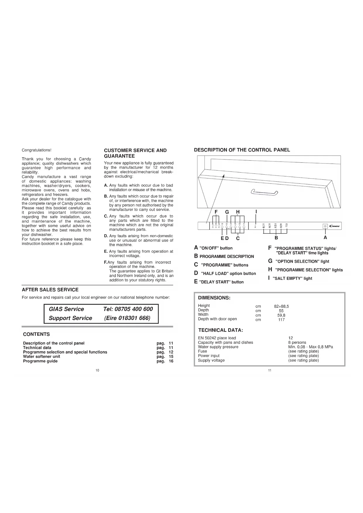Description of the control panel Technical data Programme selection and special functions Water softener unit Programme guide pag. 11 pag. 11 pag. 12 pag. 15 pag. 16 Congratulations! Thank you for choosing a Candy appliance; quality dishwashers which guarantee high performance and reliability. Candy manufacture a vast range of domestic appliances: washing machines, washer/dryers, cookers, microwave ovens, ovens and hobs, refrigerators and freezers. Ask your dealer for the catalogue with the complete range of Candy products. Please read this booklet carefully as it provides important information regarding the safe installation, use, and maintenance of the machine, together with some useful advice on how to achieve the best results from your dishwasher. For future reference please keep this instruction booklet in a safe place.