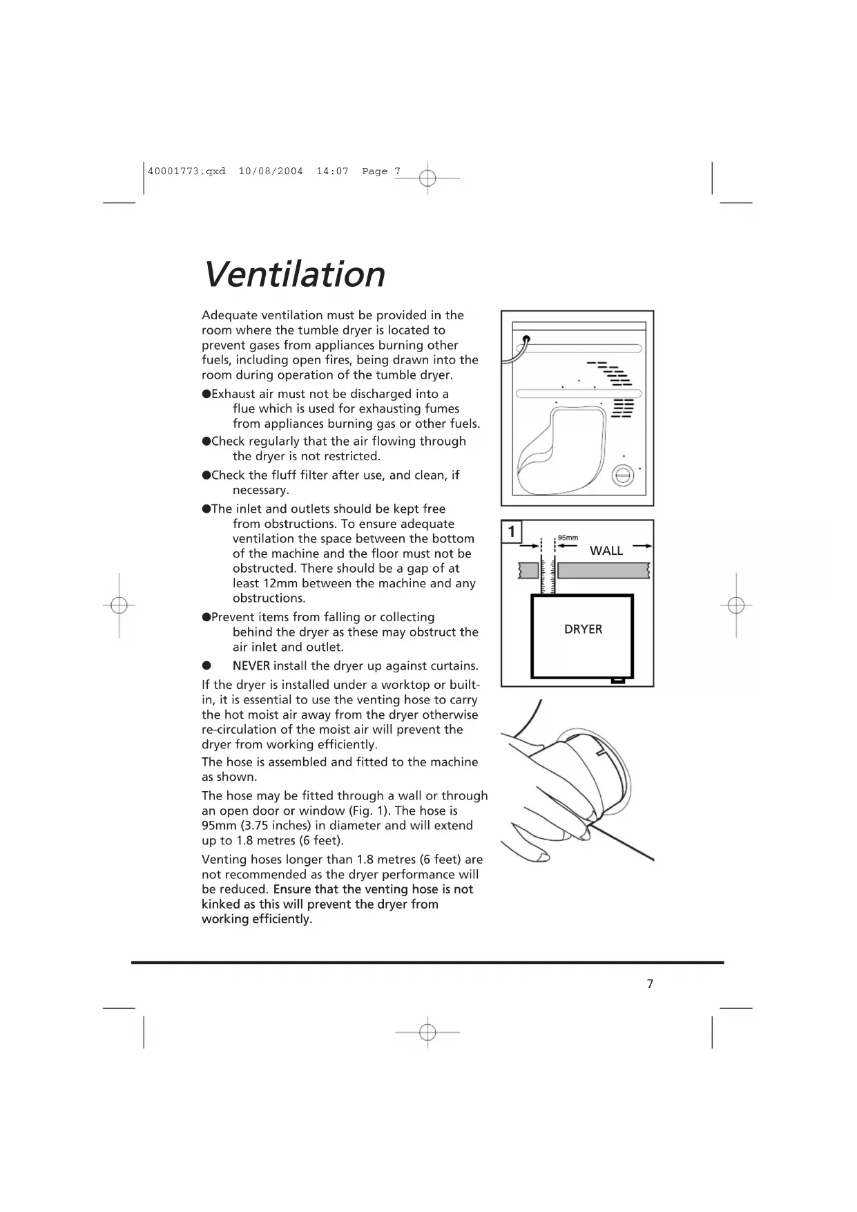 NNEEVVEERR install the dryer up against curtains. If the dryer is installed under a worktop or built- in, it is essential to use the venting hose to carry the hot moist air away from the dryer otherwise re-circulation of the moist air will prevent the dryer from working efficiently. The hose is assembled and fitted to the machine as shown. The hose may be fitted through a wall or through an open door or window (Fig. 1). The hose is 95mm (3.75 inches) in diameter and will extend up to 1.8 metres (6 feet). Venting hoses longer than 1.8 metres (6 feet) are not recommended as the dryer performance will be reduced. EEnnssuurree tthhaatt tthhee vveennttiinngg hhoossee iiss nnoott kkiinnkkeedd aass tthhiiss wwiillll pprreevveenntt tthhee ddrryyeerr ffrroomm wwoorrkkiinngg eeffffiicciieennttllyy..