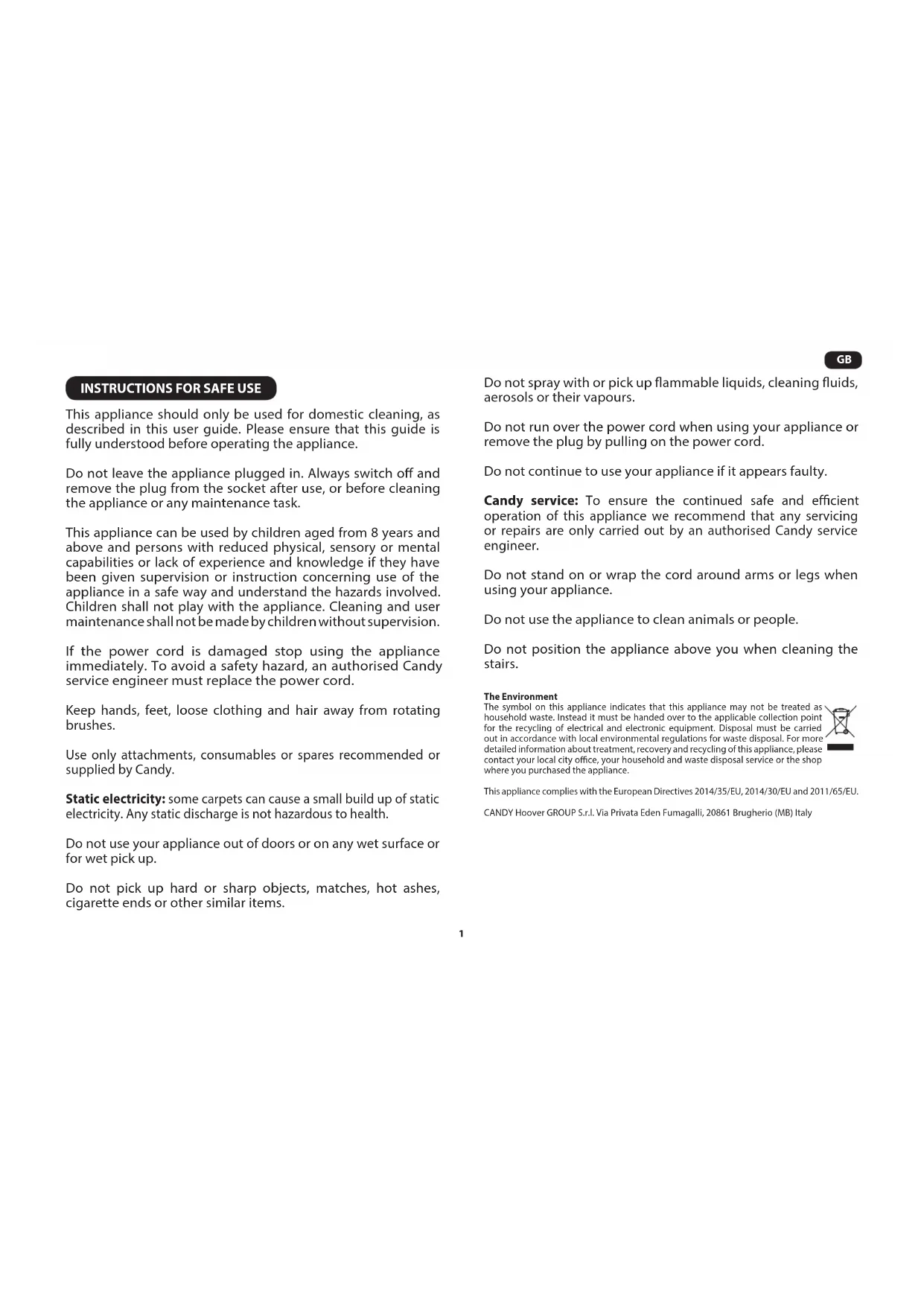 This appliance should only be used for domestic cleaning, as described in this user guide. Please ensure that this guide is fully understood before operating the appliance. Do not leave the appliance plugged in. Always switch o and remove the plug from the socket after use, or before cleaning the appliance or any maintenance task. This appliance can be used by children aged from 8 years and above and persons with reduced physical, sensory or mental capabilities or lack of experience and knowledge if they have been given supervision or instruction concerning use of the appliance in a safe way and understand the hazards involved. Children shall not play with the appliance. Cleaning and user maintenance shall not be made by children without supervision. If the power cord is damaged stop using the appliance immediately. To avoid a safety hazard, an authorised Candy service engineer must replace the power cord. Keep hands, feet, loose clothing and hair away from rotating brushes. Use only attachments, consumables or spares recommended or supplied by Candy. Static electricity: some carpets can cause a small build up of static electricity. Any static discharge is not hazardous to health. Do not use your appliance out of doors or on any wet surface or for wet pick up. Do not pick up hard or sharp objects, matches, hot ashes, cigarette ends or other similar items. Do not spray with or pick up ammable liquids, cleaning uids, aerosols or their vapours. Do not run over the power cord when using your appliance or remove the plug by pulling on the power cord. Do not continue to use your appliance if it appears faulty. Candy service: To ensure the continued safe and ecient operation of this appliance we recommend that any servicing or repairs are only carried out by an authorised Candy service engineer. Do not stand on or wrap the cord around arms or legs when using your appliance. Do not use the appliance to clean animals or people. Do not position the appliance above you when cleaning the stairs. The Environment The symbol on this appliance indicates that this appliance may not be treated as household waste. Instead it must be handed over to the applicable collection point for the recycling of electrical and electronic equipment. Disposal must be carried out in accordance with local environmental regulations for waste disposal. For more detailed information about treatment, recovery and recycling of this appliance, please contact your local city oce, your household and waste disposal service or the shop where you purchased the appliance. This appliance complies with the European Directives 2014/35/EU, 2014/30/EU and 2011/65/EU. CANDY Hoover GROUP S.r.l. Via Privata Eden Fumagalli, 20861 Brugherio (MB) Italy2