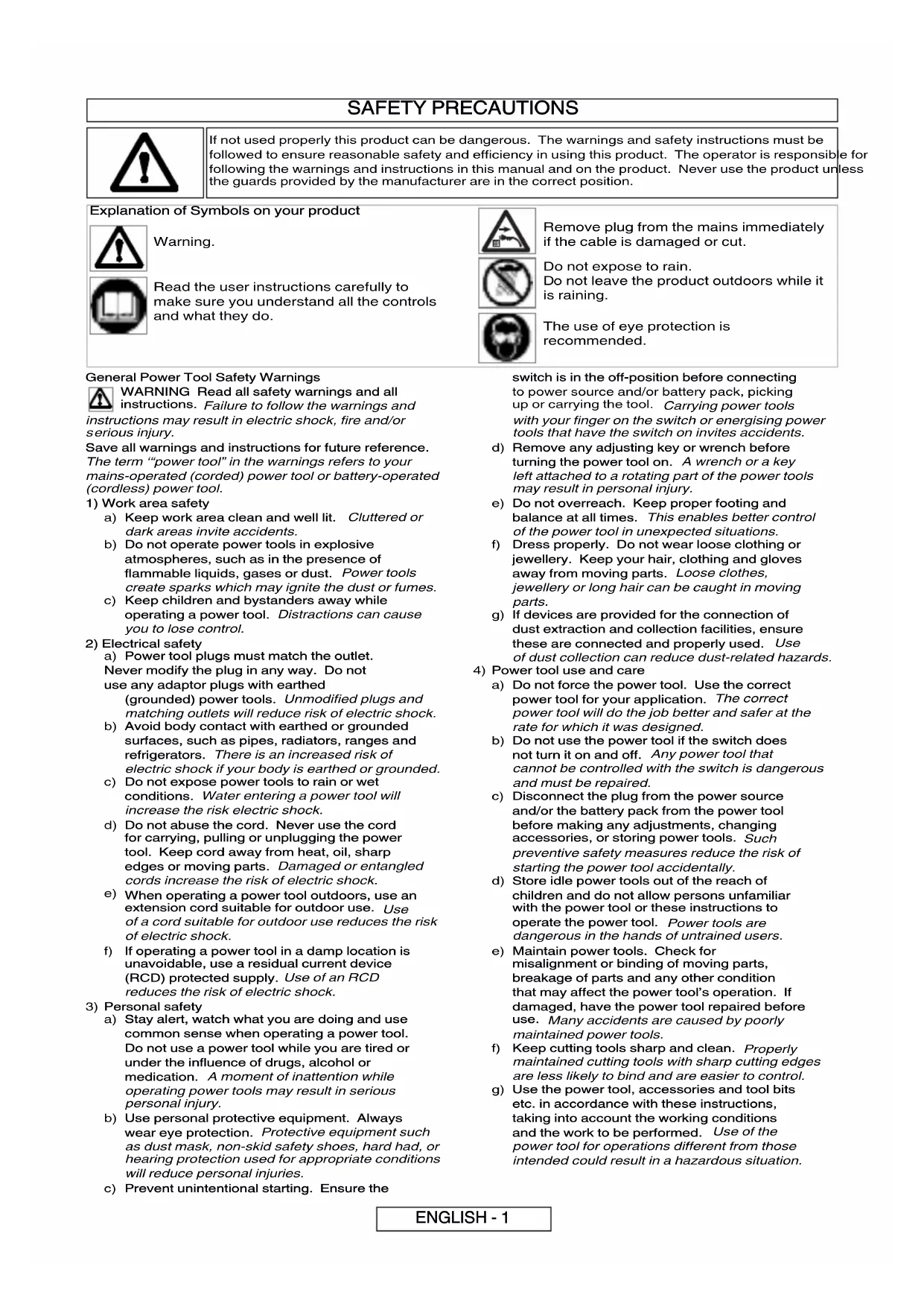 Use the power tool, accessories and tool bits etc. in accordance with these instructions, taking into account the working conditions and the work to be performed. Use of the power tool for operations different from those intended could result in a hazardous situation. If not used properly this product can be dangerous. The warnings and safety instructions must be followed to ensure reasonable safety and efficiency in using this product. The operator is responsible for following the warnings and instructions in this manual and on the product. Never use the product unless the guards provided by the manufacturer are in the correct position. ENGLISH - 1 Explanation of Symbols on your product Warning. Read the user instructions carefully to make sure you understand all the controls
