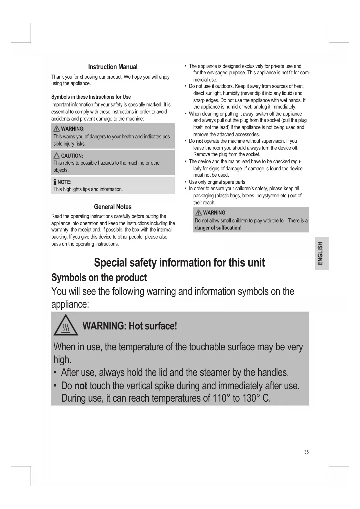 - In order to ensure your children’s safety, please keep all packaging (plastic bags, boxes, polystyrene etc.) out of their reach. WARNING! Do not allow small children to play with the foil. There is a danger of suffocation! Instruction Manual Thank you for choosing our product. We hope you will enjoy using the appliance. Symbols in these Instructions for Use Important information for your safety is specially marked. It is essential to comply with these instructions in order to avoid accidents and prevent damage to the machine: