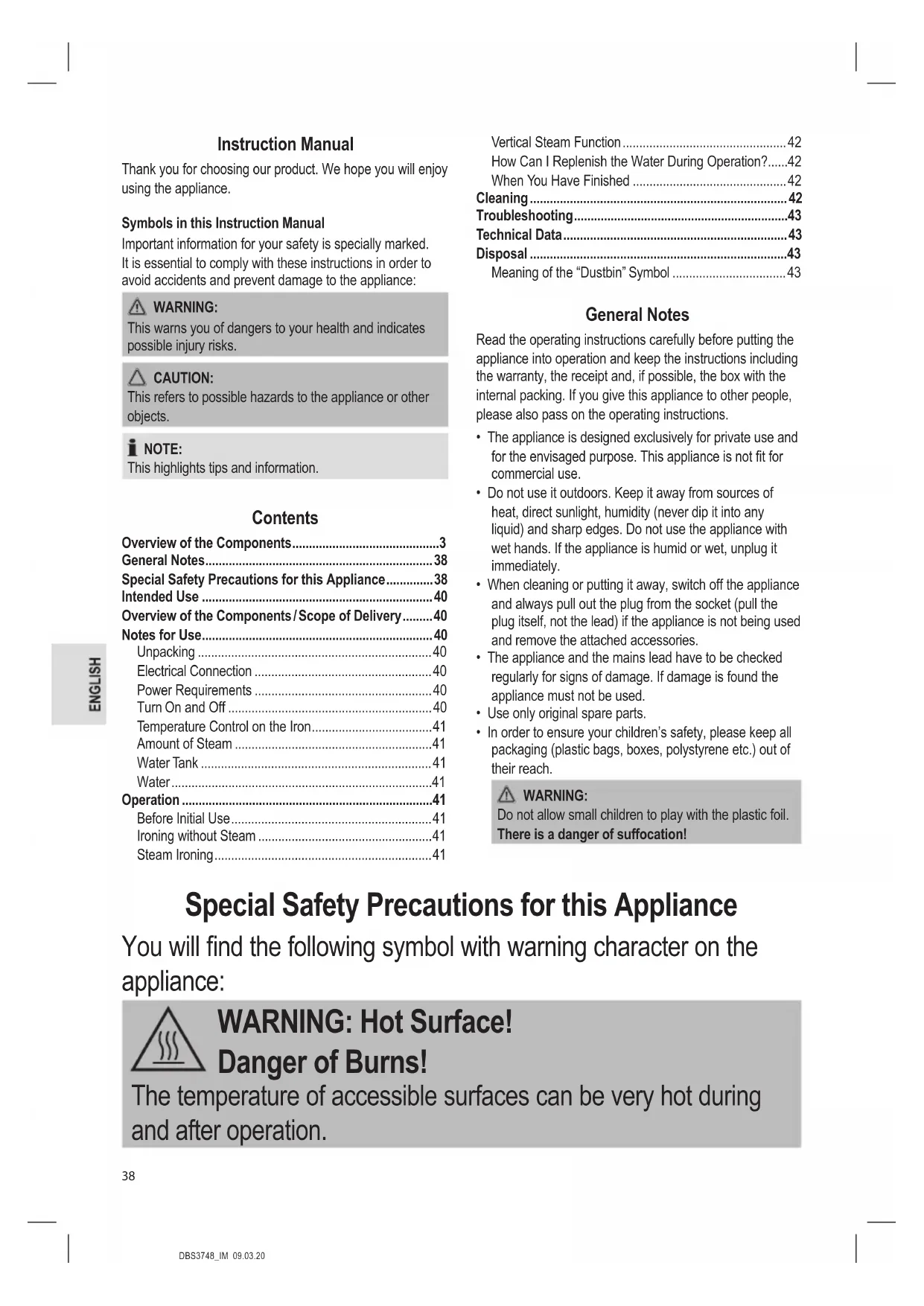 Troubleshooting Fault Possible Cause Remedy Appliance does not work. Faulty mains socket. Try another socket. The appliance suddenly stops working during operation. Is the electric circuit overloaded? Check the house fuse. No steam is generated. The water tank has not been installed correctly. Firmly push the water tank into the base. Water leaks from the soleplate. The temperature is set too low. Select a temperature between “ ” and “ ” . Loud noises during steam operation. The tank is empty. Check the tank. Fill tank with water. Initial start-up or after long periods of disuse. These noises of the pump are normal. Technical Data Model:..................................................................... DBS 3748 Power supply:...........................................220 - 240 V~, 50 Hz Power consumption: ...................................................3000 W Protection class: ..................................................................... Maximum lling quantity of the water tank: ................1.0 litre Net weight: .......................................................... approx. 3 kg The right to make technical and design modications in the course of continuous product development remains reserved. This appliance has been tested according to all relevant current CE guidelines, such as electromagnetic compatibility and low voltage directives, and is manufactured according to the latest safety regulations. Disposal Meaning of the “Dustbin” Symbol Protect our environment: do not dispose of electrical equipment in the domestic waste. Please return any electrical equipment that you will no longer use to the collection points provided for their disposal. This helps avoid the potential effects of incorrect disposal on the environment and human health. This will contribute to the recycling and other forms of re-utilisation of electrical and electronic equipment. Information concerning where the equipment can be dis- posed of can be obtained from your local authority.DBS3748_IM 09.03.20