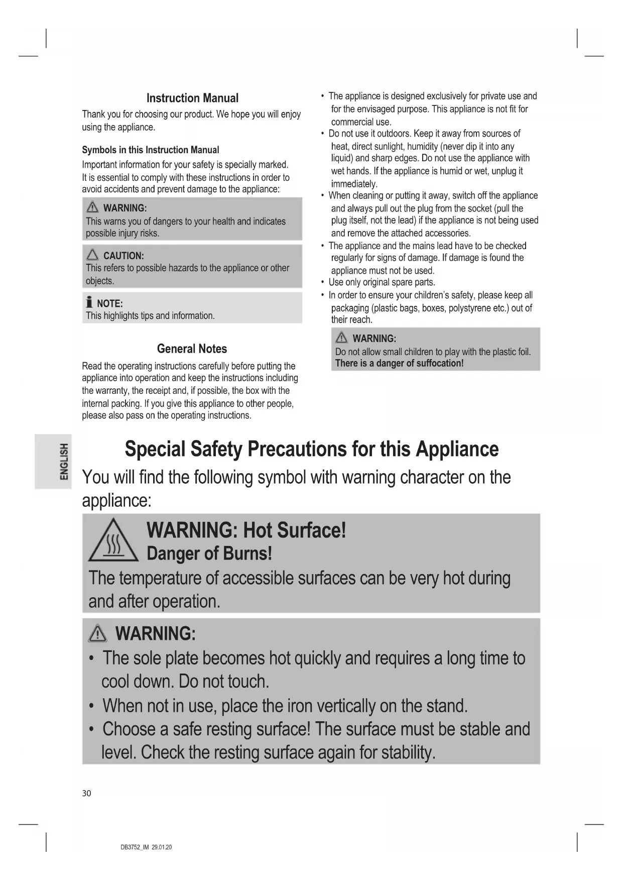 - Clean the sole plate and the rest with a slightly damp cloth. Technical Data Model:........................................................................DB 3752 Power supply:.....................................220 - 240 V~, 50 - 60 Hz Power consumption: ........................................ 1800 - 2200 W Protection class: ..................................................................... Net weight: ....................................................... approx. 0.9 kg The right to make technical and design modications in the course of continuous product development remains reserved. This appliance has been tested according to all relevant current CE guidelines, such as electromagnetic compatibility and low voltage directives, and is manufactured according to the latest safety regulations. Disposal Meaning of the “Dustbin” Symbol Protect our environment: do not dispose of electrical equipment in the domestic waste. Please return any electrical equipment that you will no longer use to the collection points provided for their disposal. This helps avoid the potential effects of incorrect disposal on the environment and human health. This will contribute to the recycling and other forms of re-utilisation of electrical and electronic equipment. Information concerning where the equipment can be disposed of can be obtained from your local authority.DB3752_IM 29.01.20