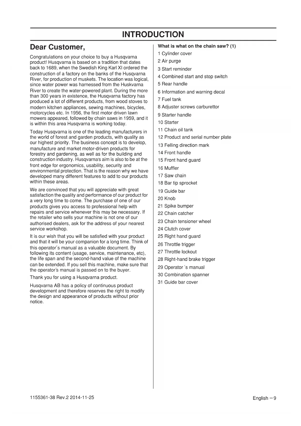 1155361-38 Rev.2 2014-11-25 Dear Customer, Congratulations on your choice to buy a Husqvarna product! Husqvarna is based on a tradition that dates back to 1689, when the Swedish King Karl XI ordered the construction of a factory on the banks of the Husqvarna River, for production of muskets. The location was logical, since water power was harnessed from the Huskvarna River to create the water-powered plant. During the more than 300 years in existence, the Husqvarna factory has produced a lot of different products, from wood stoves to modern kitchen appliances, sewing machines, bicycles, motorcycles etc. In 1956, the first motor driven lawn mowers appeared, followed by chain saws in 1959, and it is within this area Husqvarna is working today. Today Husqvarna is one of the leading manufacturers in the world of forest and garden products, with quality as our highest priority. The business concept is to develop, manufacture and market motor-driven products for forestry and gardening, as well as for the building and construction industry. Husqvarna