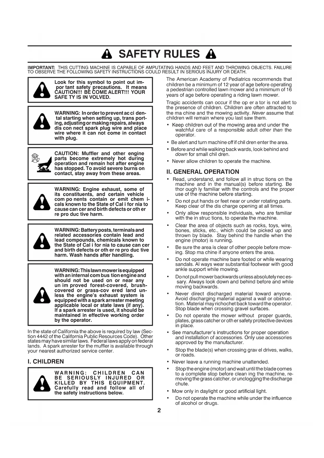 KILLED BY THIS EQUIPMENT. Carefully read and follow all of the safety instructions below. SAFETY RULES The American Academy of Pediatrics recommends that children be a minimum of 12 year of age before operating a pedestrian controlled lawn mower and a minimum of 16 years of age before operating a riding lawn mower. Tragic accidents can occur if the op er a tor is not alert to the presence of children. Children are often attracted to the ma chine and the mowing activity. Never assume that children will remain where you last saw them.