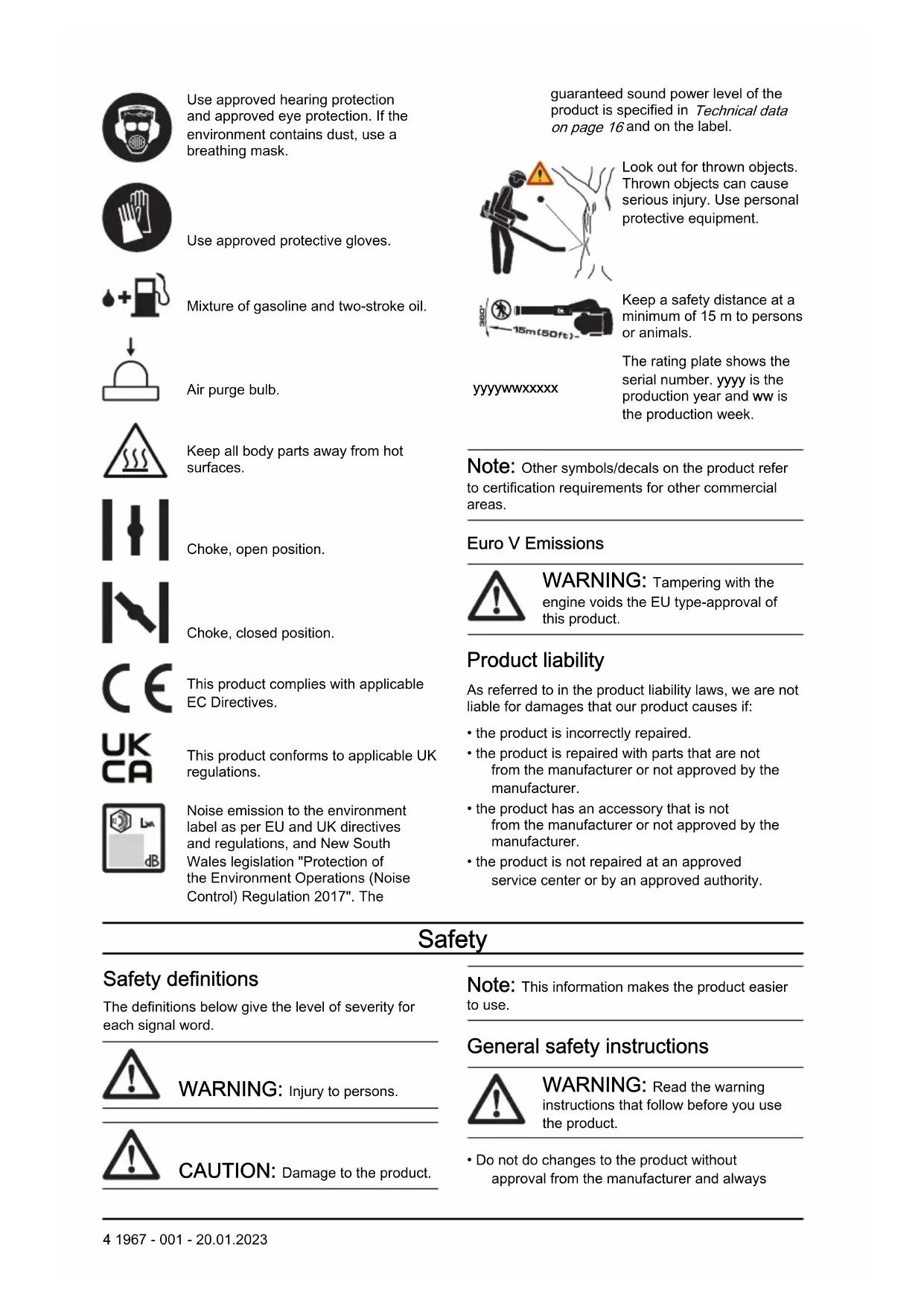 Symbols on the product WARNING! This product can be dangerous and cause serious injury or death to the operator or others. Be careful and use the product correctly. Read the operator's manual carefully and make sure that you understand the instructions before use. 1967 - 001 - 20.01.2023 3Use approved hearing protection and approved eye protection. If the environment contains dust, use a breathing mask. Use approved protective gloves. Mixture of gasoline and two-stroke oil. Air purge bulb. Keep all body parts away from hot surfaces. Choke, open position. Choke, closed position. This product complies with applicable EC Directives. This product conforms to applicable UK regulations. Noise emission to the environment label as per EU and UK directives and regulations, and New South Wales legislation "Protection of the Environment Operations (Noise Control) Regulation 2017". The guaranteed sound power level of the product is specified in Technical data on page 16 and on the label. Look out for thrown objects. Thrown objects can cause serious injury. Use personal protective equipment. Keep a safety distance at a minimum of 15 m to persons or animals. yyyywwxxxxx The rating plate shows the serial number. yyyy is the production year and ww is the production week. Note: Other symbols/decals on the product refer to certification requirements for other commercial areas. Euro V Emissions