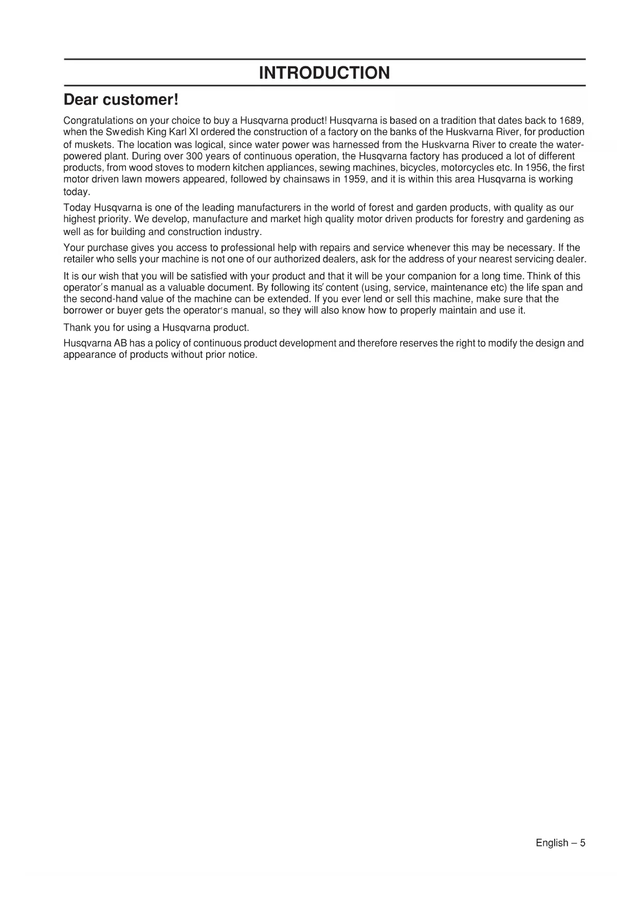 INTR ODUCTION Dear customer! Cong ratulations on your choice to buy a Husqvarna product! Husqvarna is based on a tradition that dates back to 1689, when the Sw edish King Karl XI ordered the construction of a factory on the banks of the Huskvarna River, for production of muskets. The location was logical, since water power was harnessed from the Huskvarna River to create the water- powered plant. During over 300 years of continuous operation, the Husqvarna factory has produced a lot of different products, from wood stoves to modern kitchen appliances, sewing machines, bicycles, motorcycles etc. In 1956, the first motor driven lawn mowers appeared, followed by chainsaws in 1959, and it is within this area Husqvarna is working today. Today Husqvarna is one of the leading manufacturers in the world of forest and garden products, with quality as our highest pr iority. We develop, manufacture and market high quality motor driven products for forestry and gardening as well as for building and construction industry. Your purchase gives you access to professional help with repairs and service whenever this may be necessary. If the retailer who sells y our machine is not one of our authorized dealers, ask for the address of your nearest servicing dealer. It is our wish that you will be satisfied with your product and that it will be your companion for a long time. Think of this oper ator