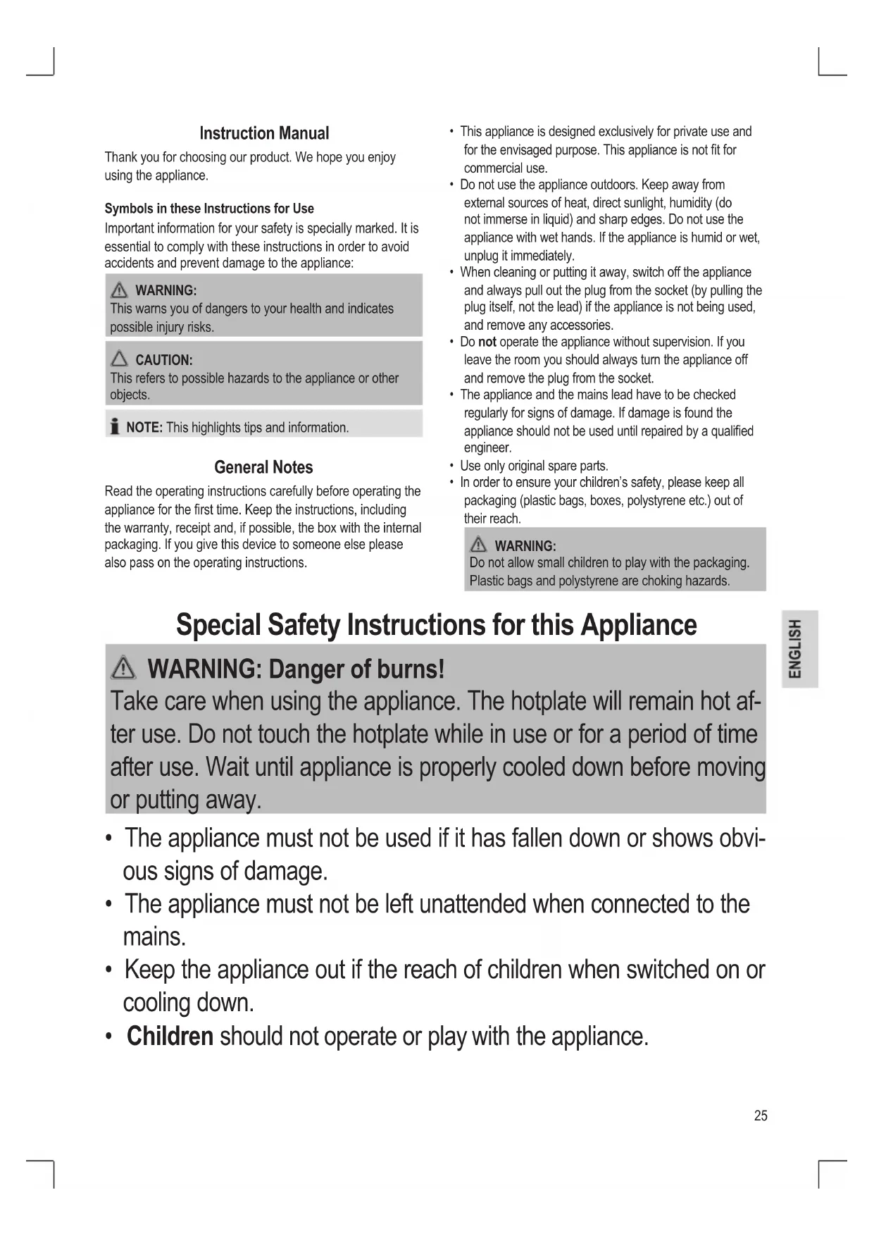 Take care when using the appliance. The hotplate will remain hot af- ter use. Do not touch the hotplate while in use or for a period of time after use. Wait until appliance is properly cooled down before moving or putting away.