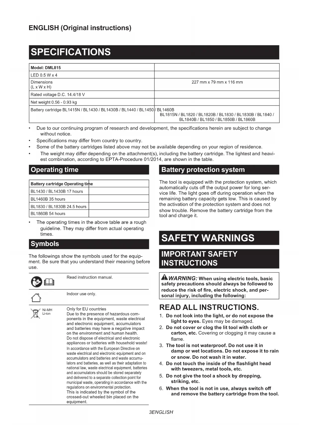 - Theoperatingtimesintheabovetablearearough guideline.Theymaydierfromactualoperating times. Symbols Thefollowingsshowthesymbolsusedfortheequip- ment.Besurethatyouunderstandtheirmeaningbefore use. Read instruction manual.Indoor use only. Ni-MH Li-ionOnly for EU countriesDue to the presence of hazardous com-ponentsintheequipment,wasteelectricalandelectronicequipment,accumulatorsandbatteriesmayhaveanegativeimpacton the environment and human health.Do not dispose of electrical and electronic appliancesorbatterieswithhouseholdwaste!In accordance with the European Directive on wasteelectricalandelectronicequipmentandonaccumulatorsandbatteriesandwasteaccumu-latorsandbatteries,aswellastheiradaptationtonationallaw,wasteelectricalequipment,batteriesandaccumulatorsshouldbestoredseparatelyand delivered to a separate collection point for municipal waste, operating in accordance with the regulations on environmental protection.Thisisindicatedbythesymbolofthecrossed-outwheeledbinplacedontheequipment. Battery protection system Thetoolisequippedwiththeprotectionsystem,which automaticallycutsotheoutputpowerforlongser- vicelife.Thelightgoesoduringoperationwhenthe remainingbatterycapacitygetslow.Thisiscausedby the activation of the protection system and does not showtrouble.Removethebatterycartridgefromthe tool and charge it. SAFETY WARNINGS IMPORTANT SAFETY INSTRUCTIONS