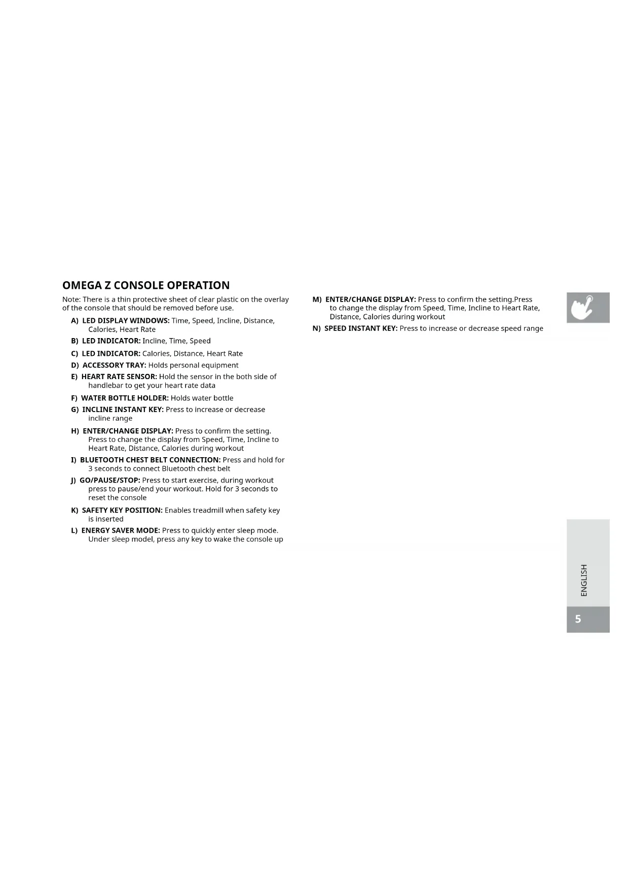 Note: There is a thin protective sheet of clear plastic on the overlay of the console that should be removed before use. A) LED DISPLAY WINDOWS: Time, Speed, Incline, Distance, Calories, Heart Rate B) LED INDICATOR: Incline, Time, Speed C) LED INDICATOR: Calories, Distance, Heart Rate D) ACCESSORY TRAY: Holds personal equipment E) HEART RATE SENSOR: Hold the sensor in the both side of handlebar to get your heart rate data F) WATER BOTTLE HOLDER: Holds water bottle G) INCLINE INSTANT KEY: Press to increase or decrease incline range H) ENTER/CHANGE DISPLAY: Press to confirm the setting. Press to change the display from Speed, Time, Incline to Heart Rate, Distance, Calories during workout