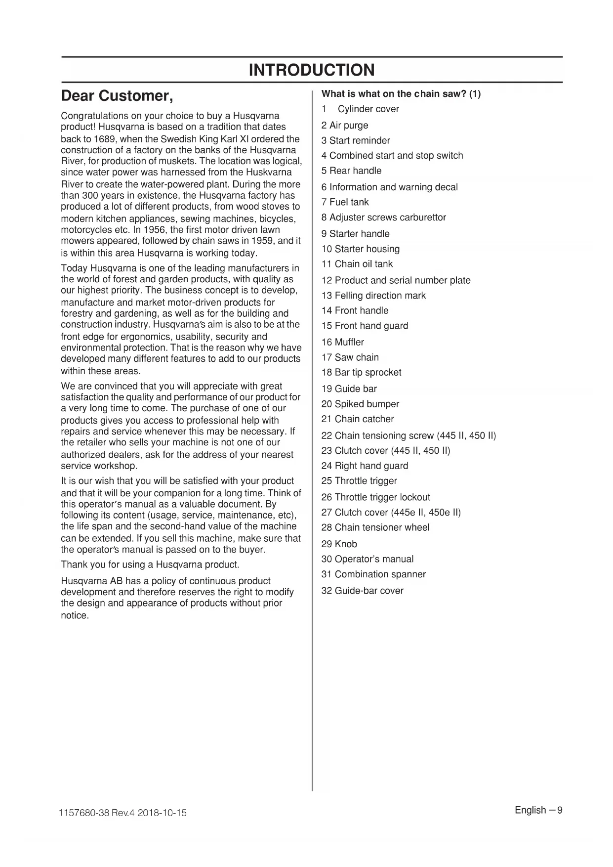 Cylinder cover 2 Air purge 3 Start reminder 4 Combined start and stop switch 5 Rear handle 6 Information and warning decal 7 Fuel tank 8 Adjuster screws carburettor 9 Starter handle 10 Starter housing 11 Chain oil tank 12 Product and serial number plate 13 Felling direction mark 14 Front handle 15 Front hand guard 16 Muffler 17 Saw chain 18 Bar tip sprocket 19 Guide bar 20 Spiked bumper 21 Chain catcher 22 Chain tensioning screw (445 II, 450 II) 23 Clutch cover (445 II, 450 II) 24 Right hand guard 25 Throttle trigger 26 Throttle trigger lockout 27 Clutch cover (445e II, 450e II) 28 Chain tensioner wheel 29 Knob 30 Operator’s manual 31 Combination spanner 32 Guide-bar coverGENERAL SAFETY PRECA UTIONS