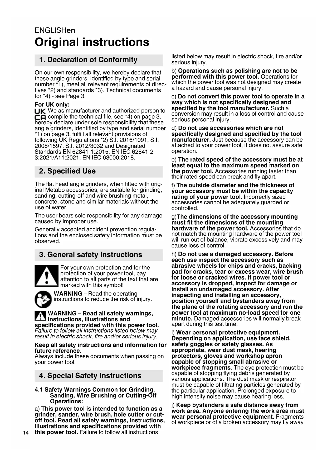Original instructions On our own responsibility, we hereby declare that these angle grinders, identified by type and serial number *1), meet all relevant requirements of direc- tives *2) and standards *3). Technical documents for *4) - see Page 3. For UK only: We as manufacturer and authorized person to compile the technical file, see *4) on page 3, hereby declare under sole responsibility that these angle grinders, identified by type and serial number *1) on page 3, fulfill all relevant provisions of following UK Regulations *2) S.I. 2016/1091, S.I. 2008/1597, S.I. 2012/3032 and Designated Standards EN 62841-1:2015, EN IEC 62841-2- 3:2021/A11:2021, EN IEC 63000:2018. The flat head angle grinders, when fitted with orig- inal Metabo accessories, are suitable for grinding, sanding, cutting-off and wire brushing metal, concrete, stone and similar materials without the use of water. The user bears sole responsibility for any damage caused by improper use. Generally accepted accident prevention regula- tions and the enclosed safety information must be observed. For your own protection and for the protection of your power tool, pay attention to all parts of the text that are marked with this symbol! WARNING – Read the operating instructions to reduce the risk of injury. WARNING – Read all safety warnings, instructions, illustrations and specifications provided with this power tool. Failure to follow all instructions listed below may result in electric shock, fire and/or serious injury. Keep all safety instructions and information for future reference. Always include these documents when passing on your power tool.